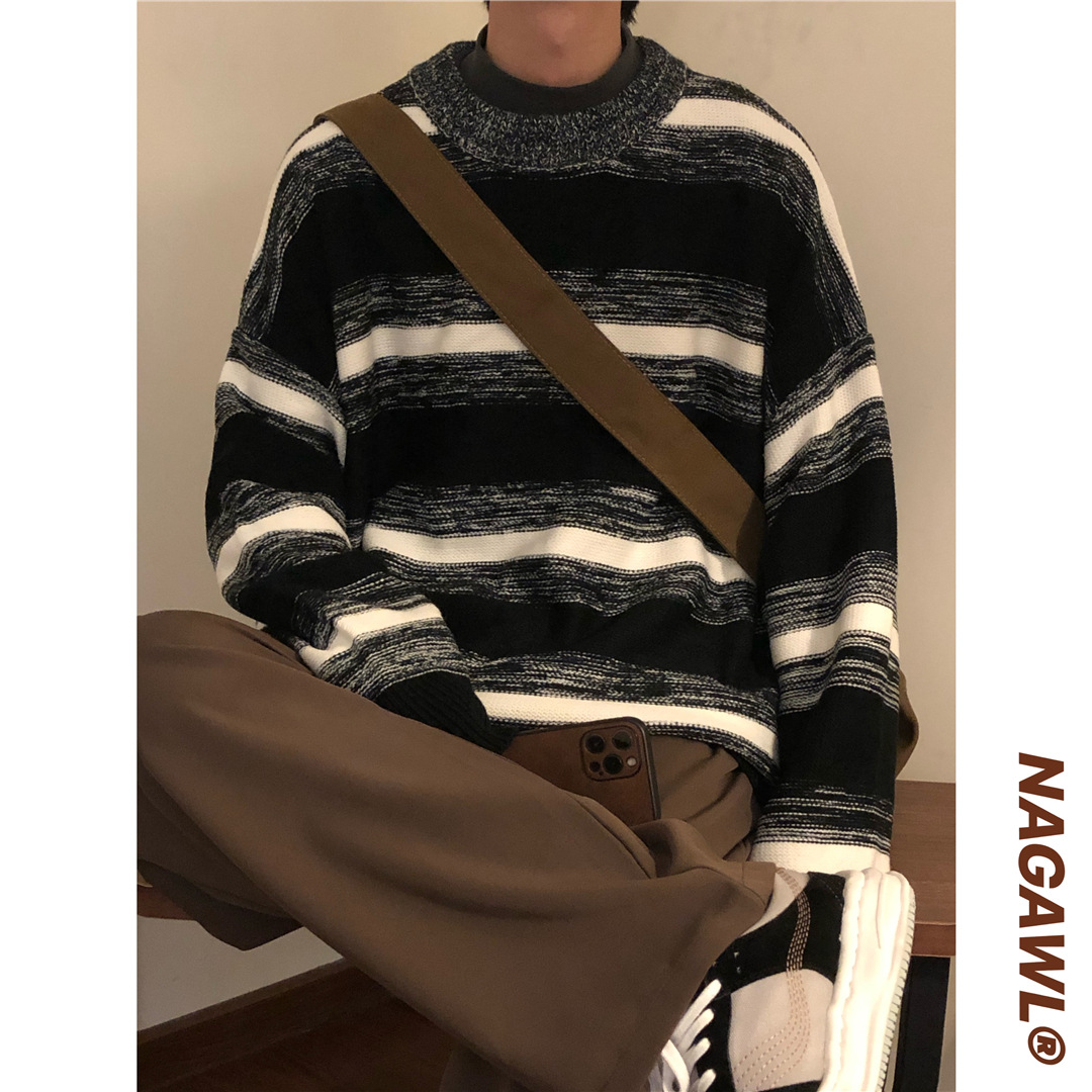 느슨한 겨울 남자의 패션 디자인 감각 흑백 스트라이프 니트웨어 남자의 미국 스타일 복고풍 풀오버 스웨터 게으른 스타일