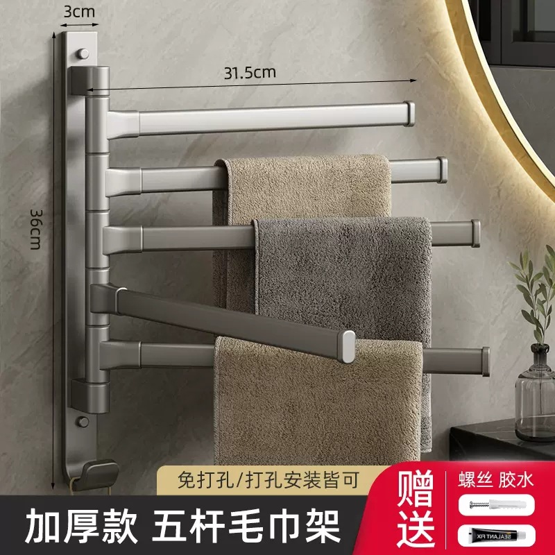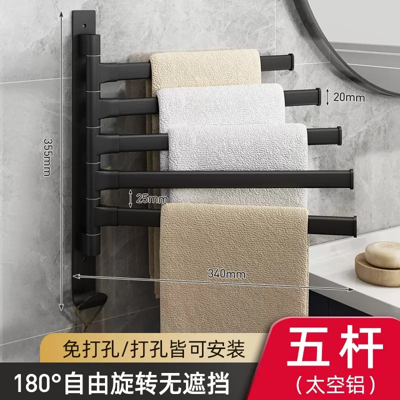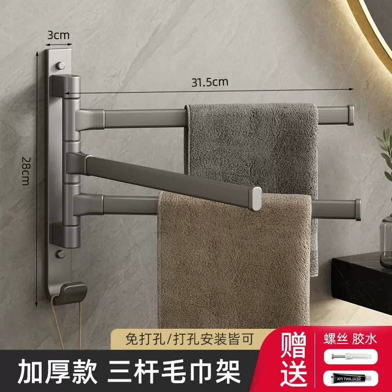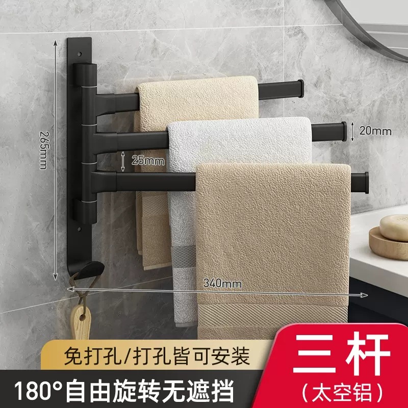 枪灰旋转毛巾架免打孔太空铝卫生间壁挂架子多杆浴室置物架毛巾杆