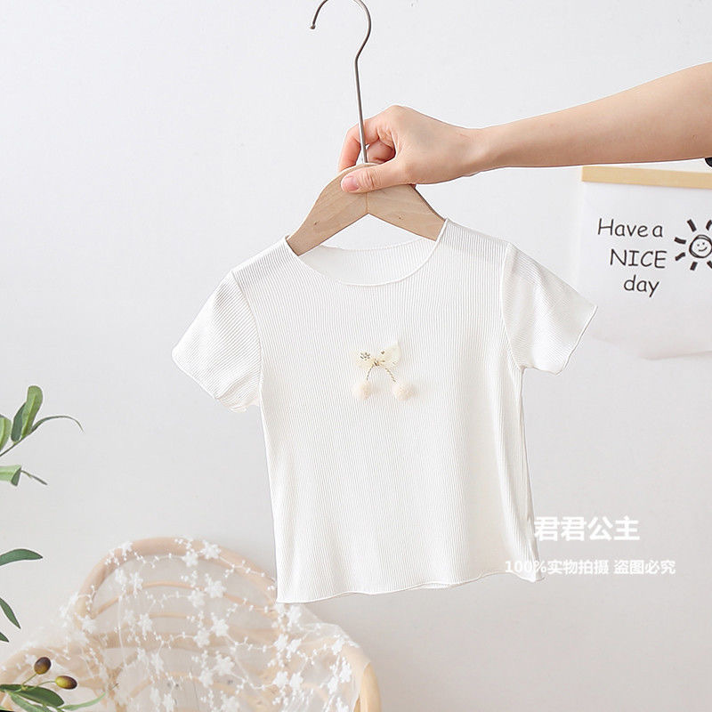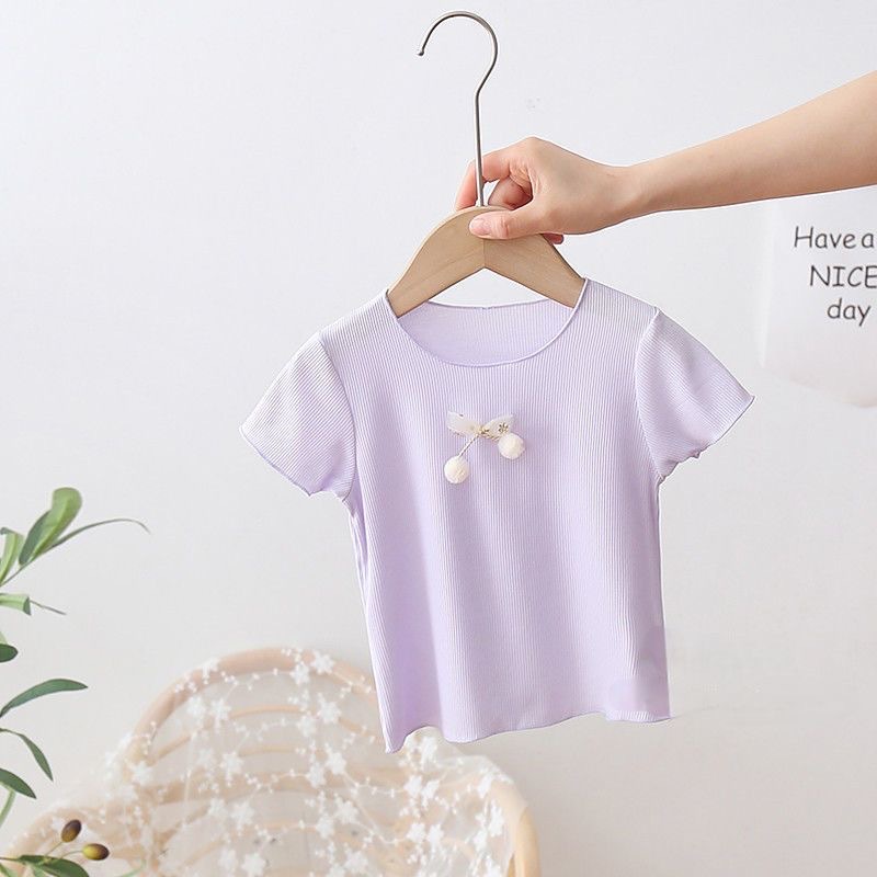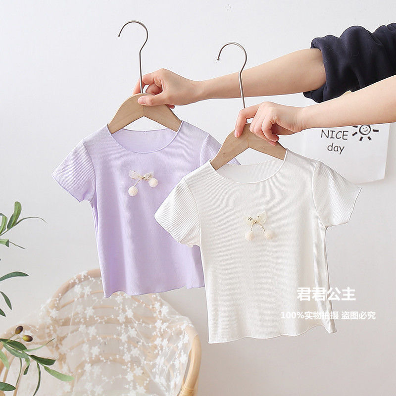 여아 아이스 실크 여름 새로운 통기성 반팔 솔리드 컬러 심플 모든 매치 캔디 컬러 어린이 티셔츠 어린이 탑