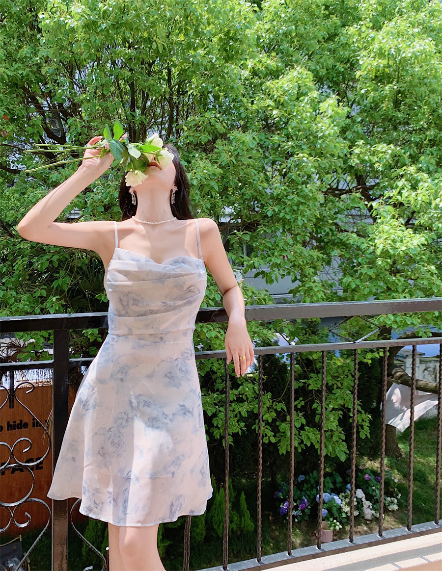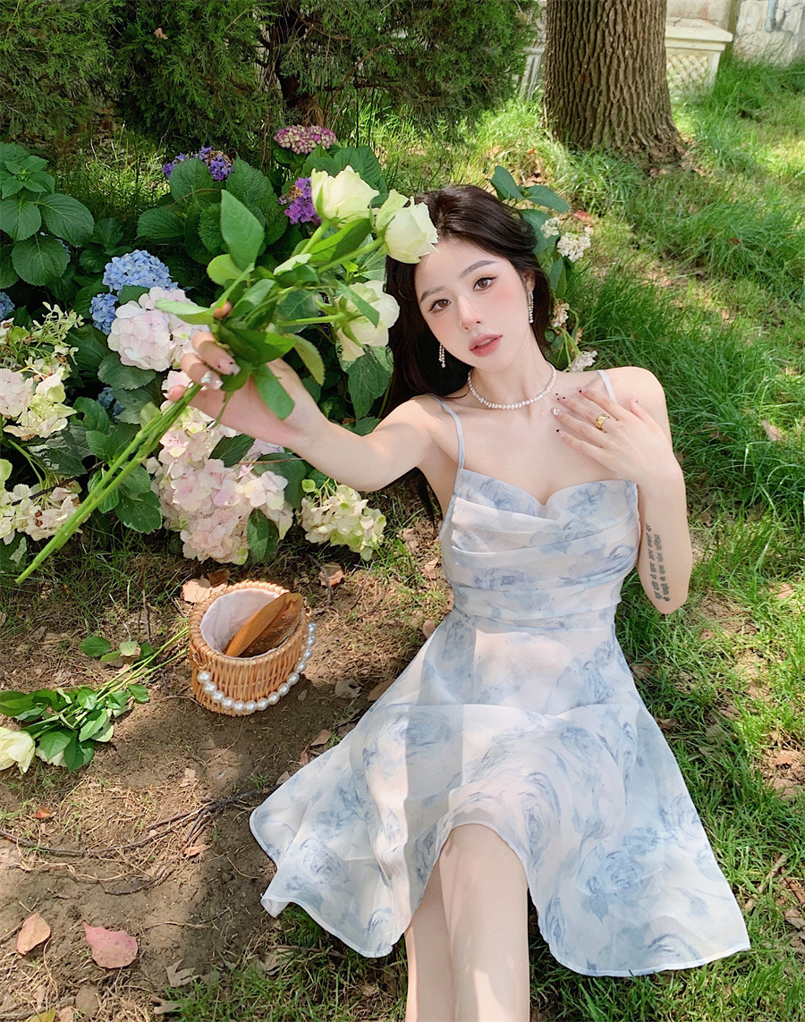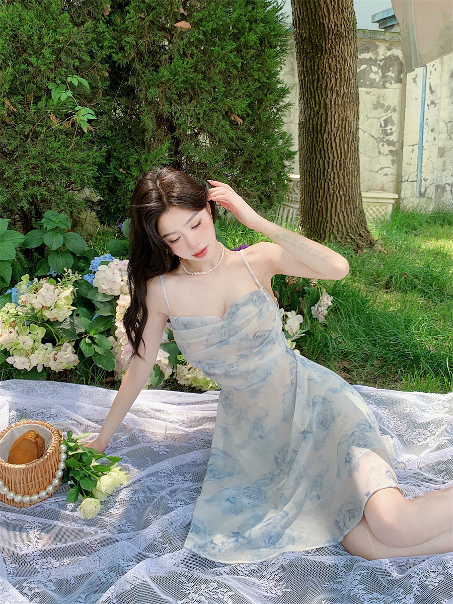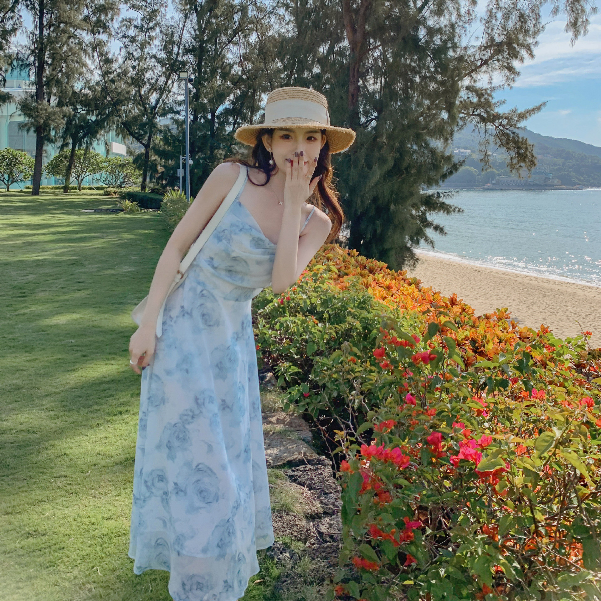 슈퍼 페어리 블루 슬립 스커트 여자의 여름 해변 휴가 하이 엔드 쉬폰 꽃 원피스스토어 가기