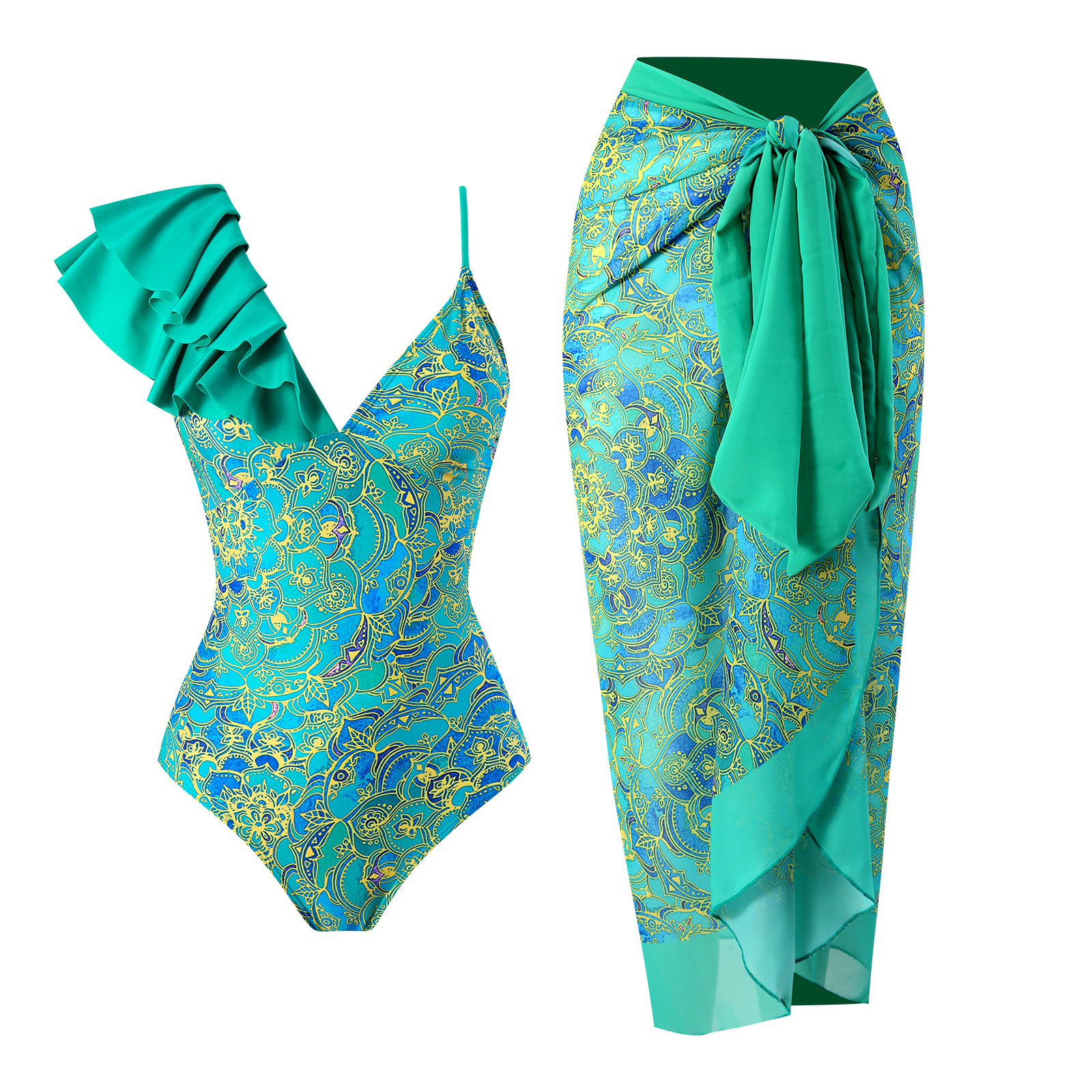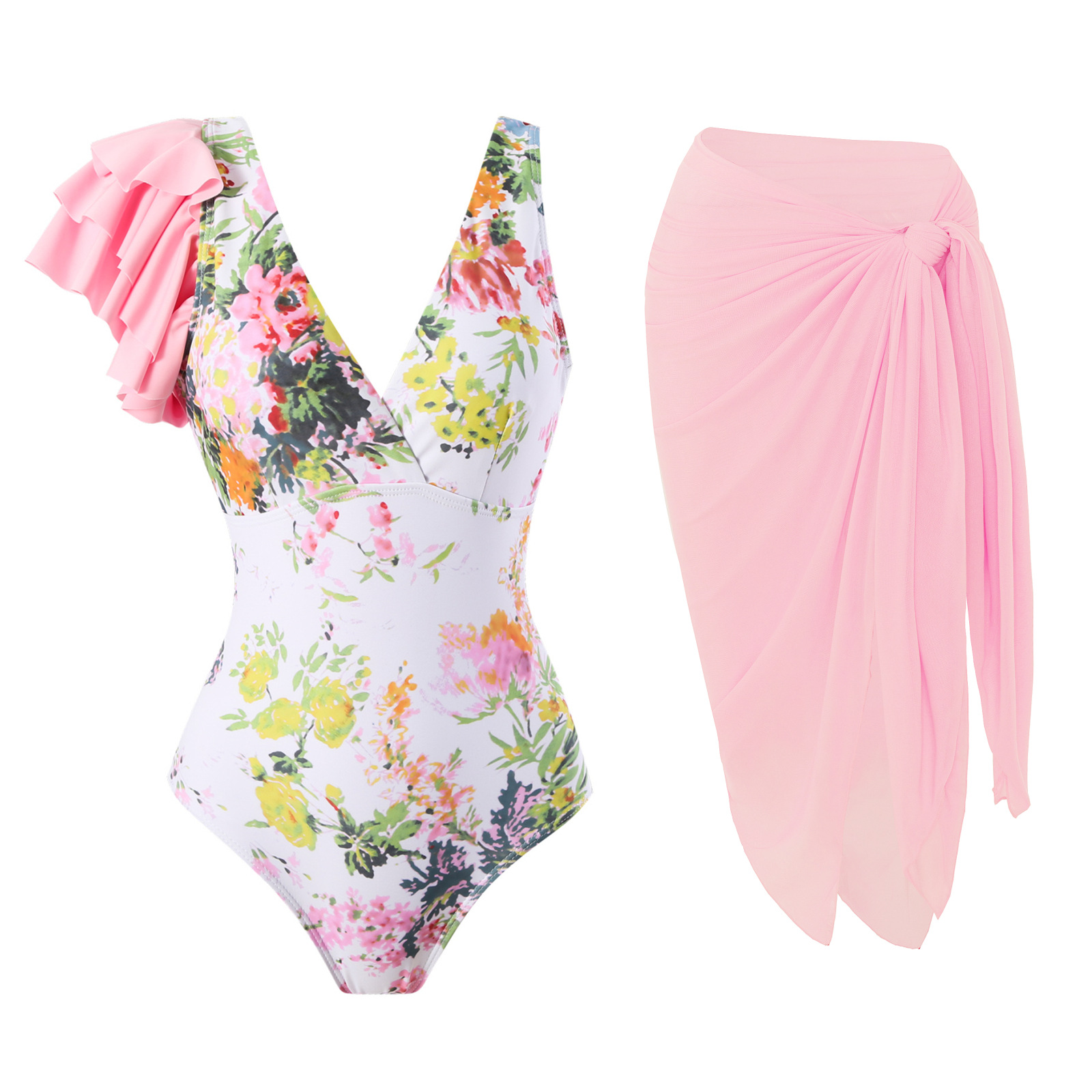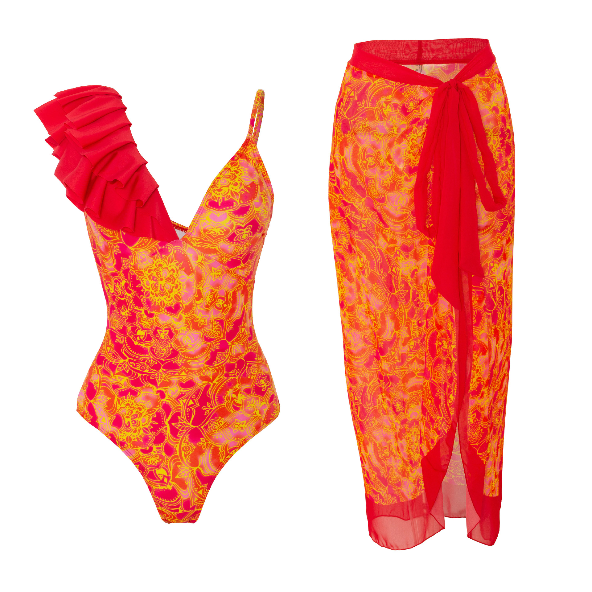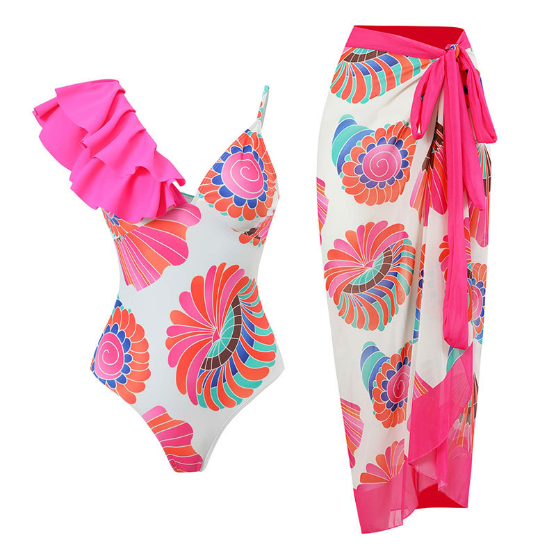 유럽과 미국의 스팟 2025 패셔너블하고 섹시한 새로운 원피스 수영복 여성 스플릿 투피스 쉬폰 스커트 수영복 세트