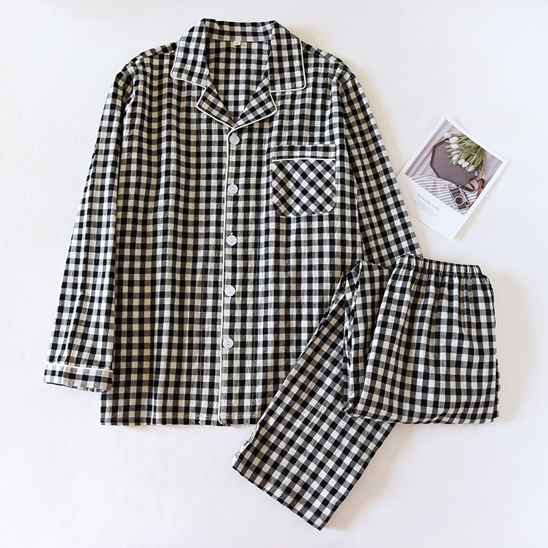 봄과 가을면 일본 격자 무늬 커플 잠옷 여성 면 얇은 여름 남자 가을과 겨울 긴 소매 홈 세트