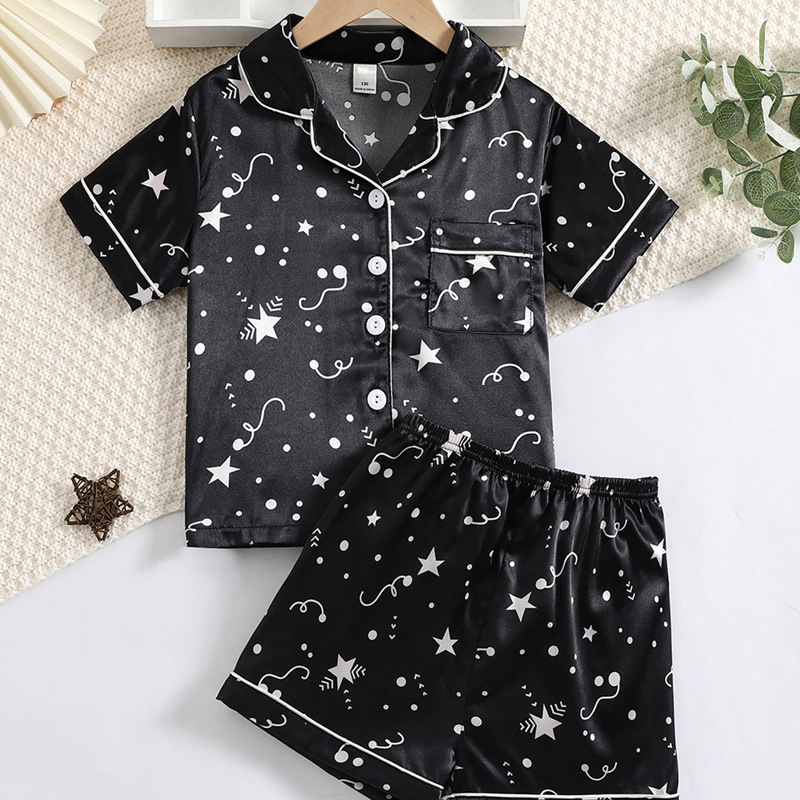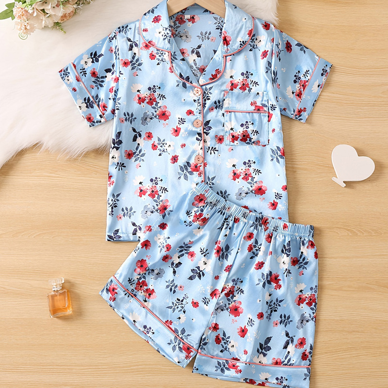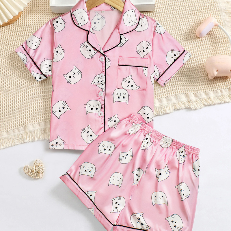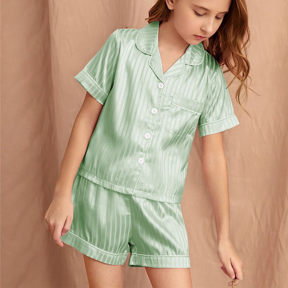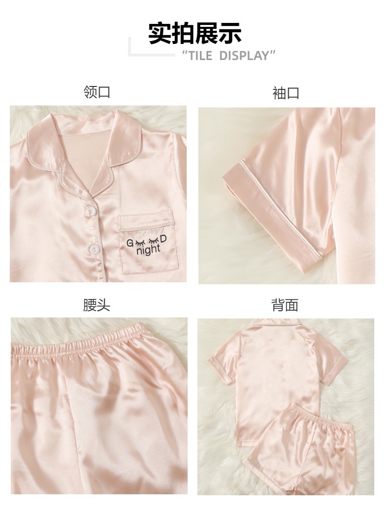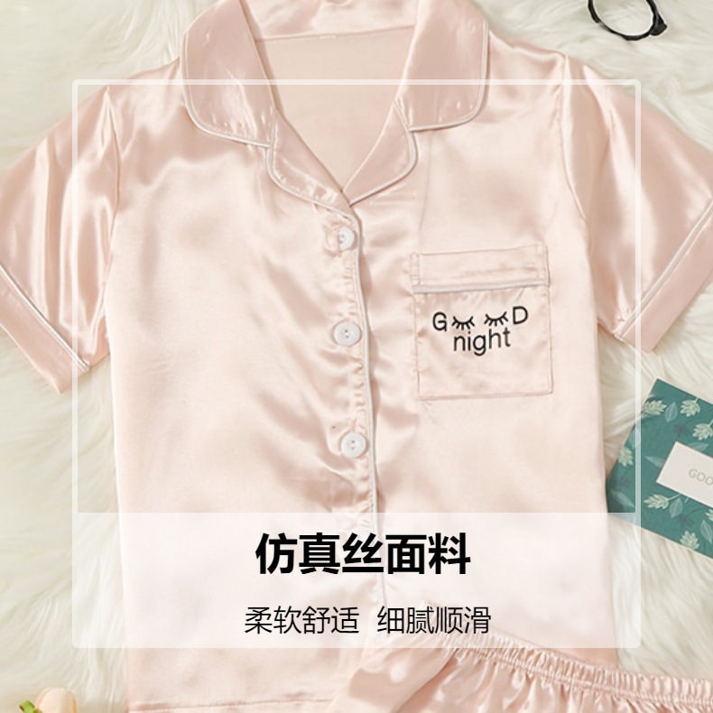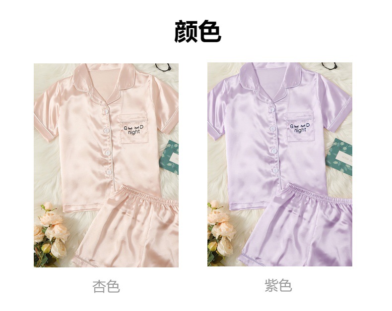 크로스 보더 어린이 잠옷 여름 단색 세이드 세트 반팔 반바지 여아 캐주얼 편안한 모조 실크 가정 옷