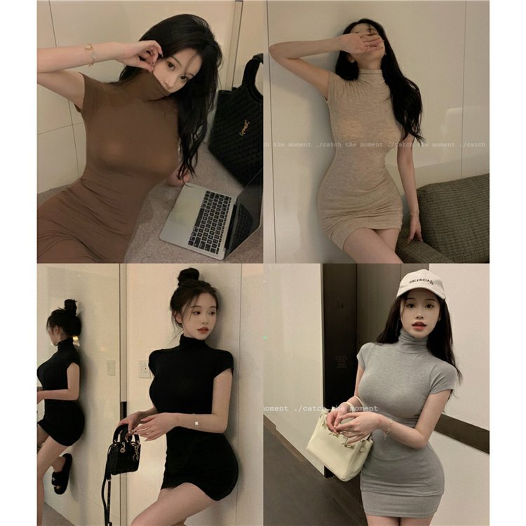 순수한 욕망 스타일 섹시 슬림 핏 반팔 하이 칼라 원피스 여성 여름 핫 걸 스커트 꽉 끼는 타이트 허리 우아한 힙 랩 스커트스토어 가기