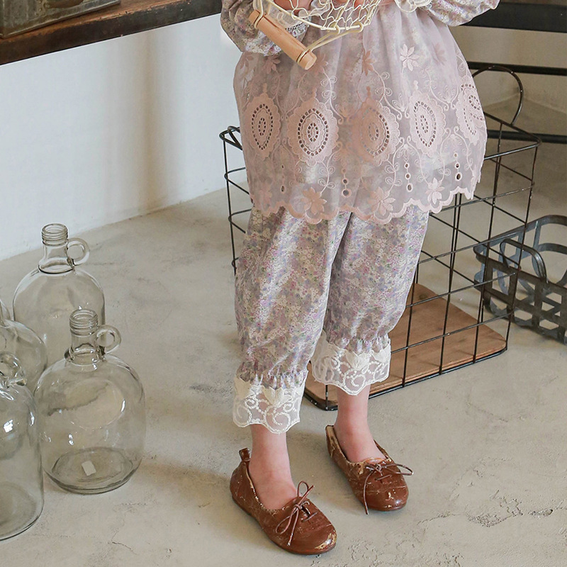 2026 봄 신상품 스트로베리 샨 한국 아동 여아용 세련된 꽃무늬 바지 레이스 트리밍 캐주얼 바지 모기 방지 바지스토어 가기
