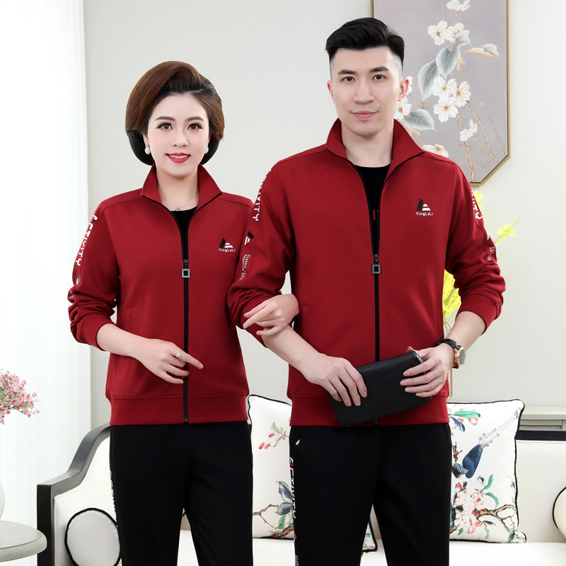 봄 2023 남성과 여성을 위한 새로운 중년 커플 면 쓰리피스 스포츠 세트 캐주얼 스포츠웨어 엄마와 아빠
