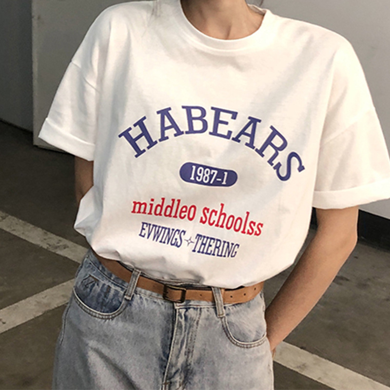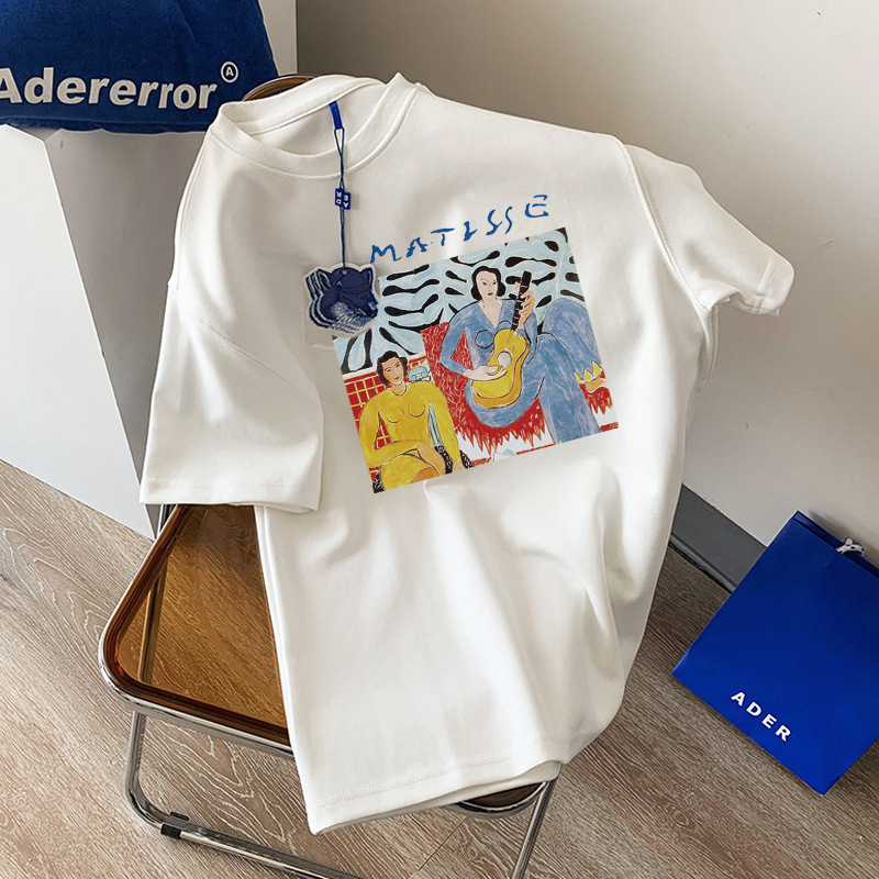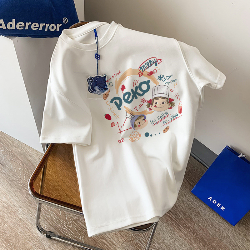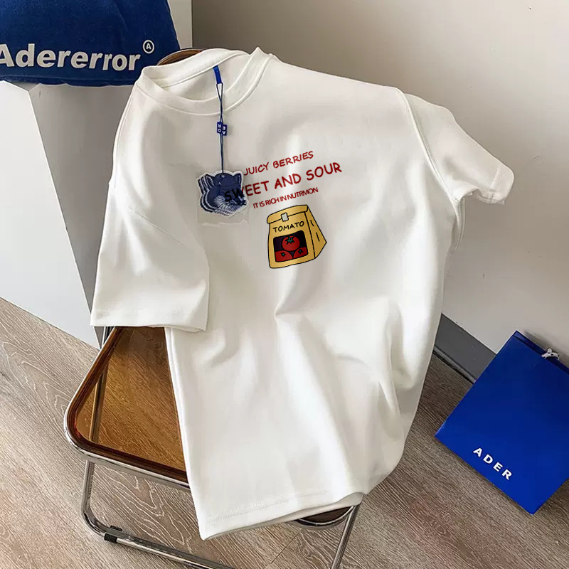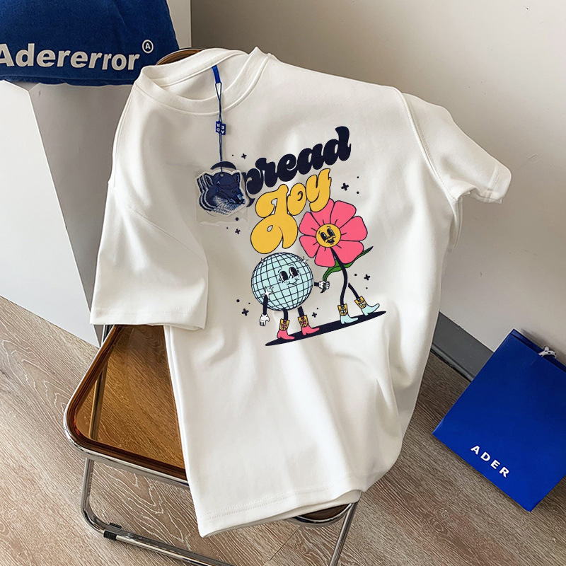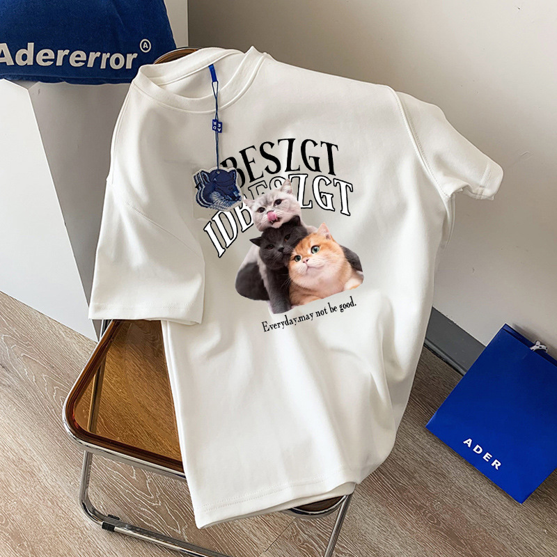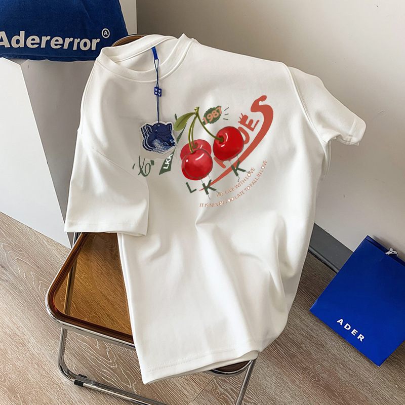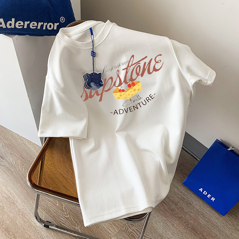 트렌디한 화이트 순면 반팔 티셔츠 여성 여름 루즈핏 디자인 감성적인 2025 신상 프린트 오버숄더 탑스토어 가기