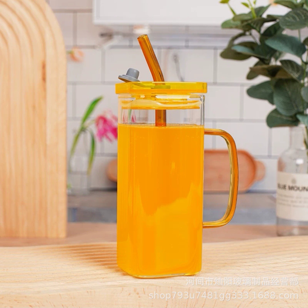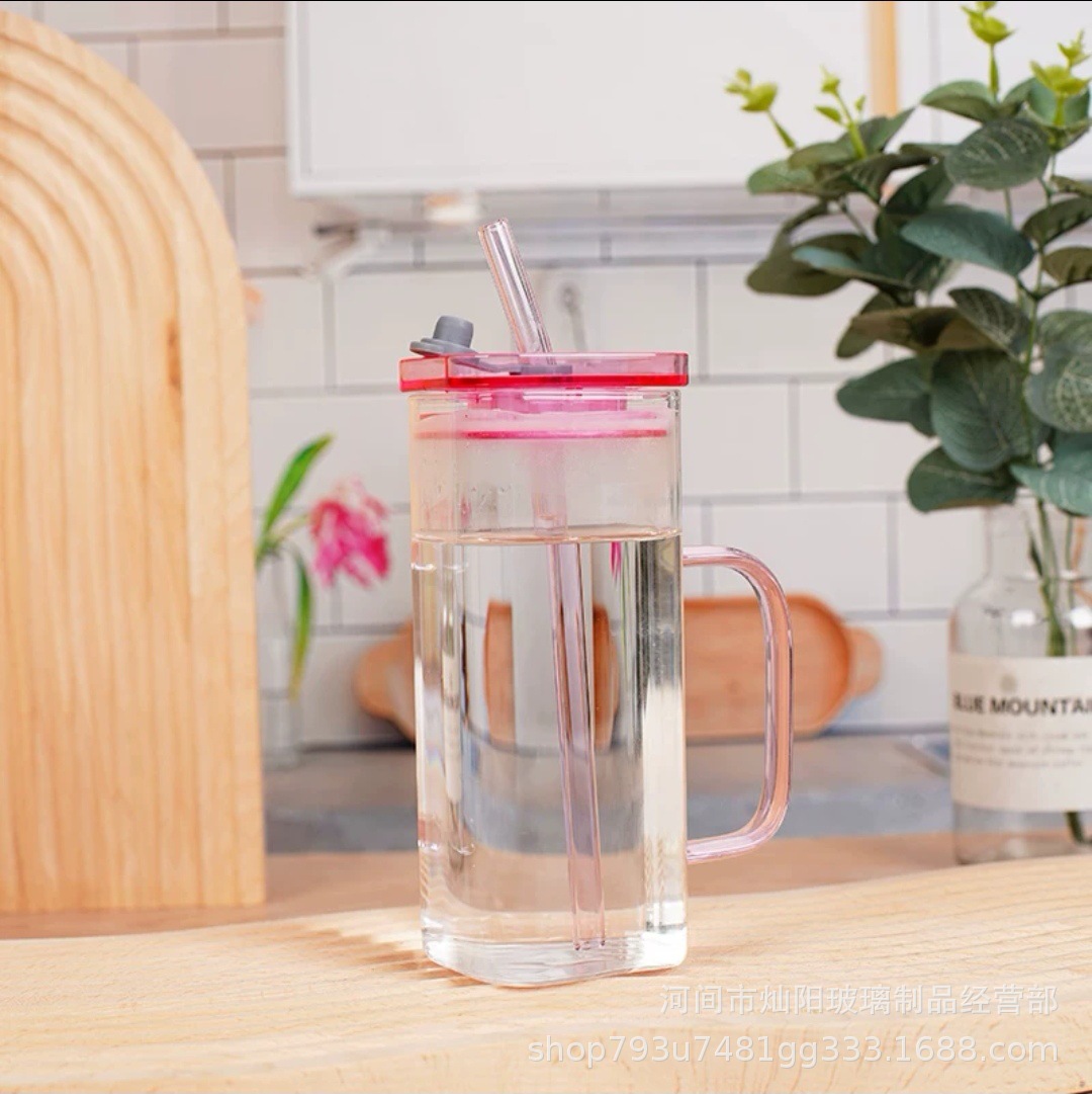 스퀘어 컬러 커버 높은 붕규산 유리 컵 빨대 컵 창조적 인 가정용 고온 저항 여성용 물 컵 심플 인 스타일