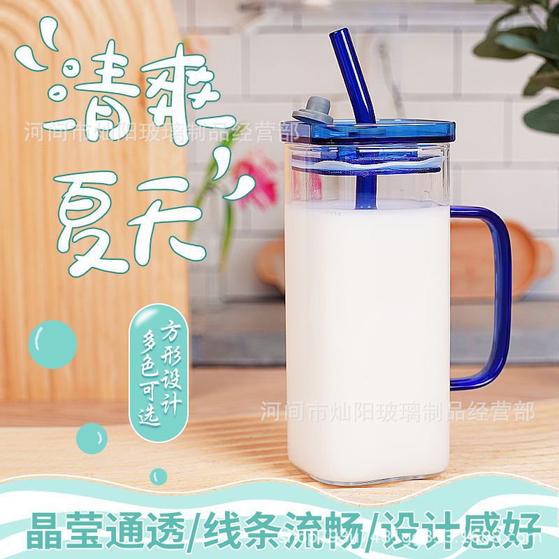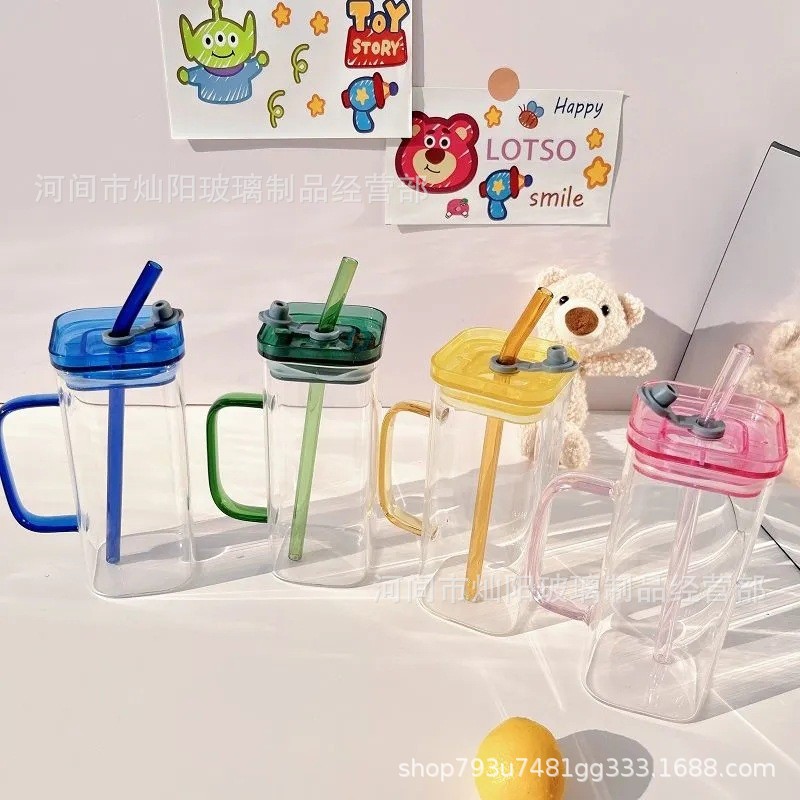 스퀘어 컬러 커버 높은 붕규산 유리 컵 빨대 컵 창조적 인 가정용 고온 저항 여성용 물 컵 심플 인 스타일스토어 가기
