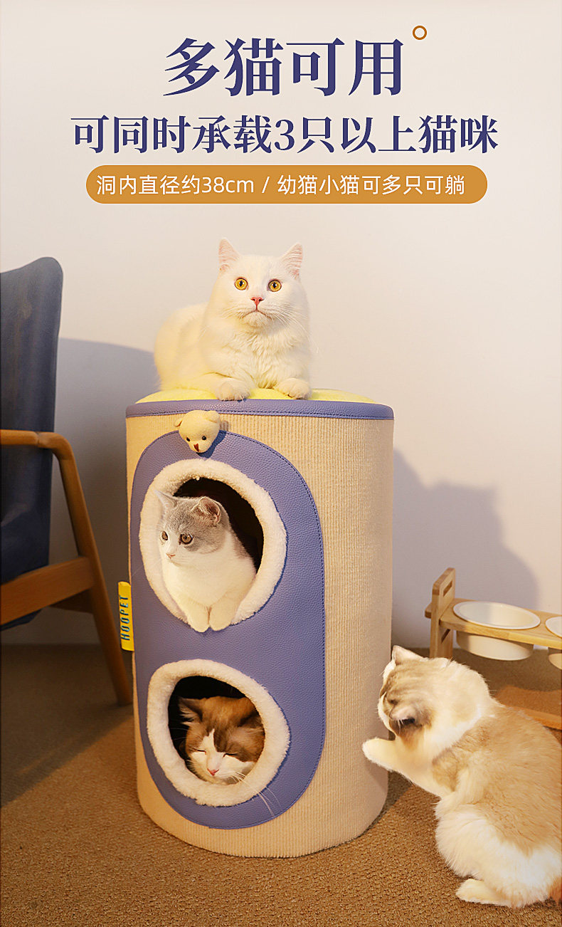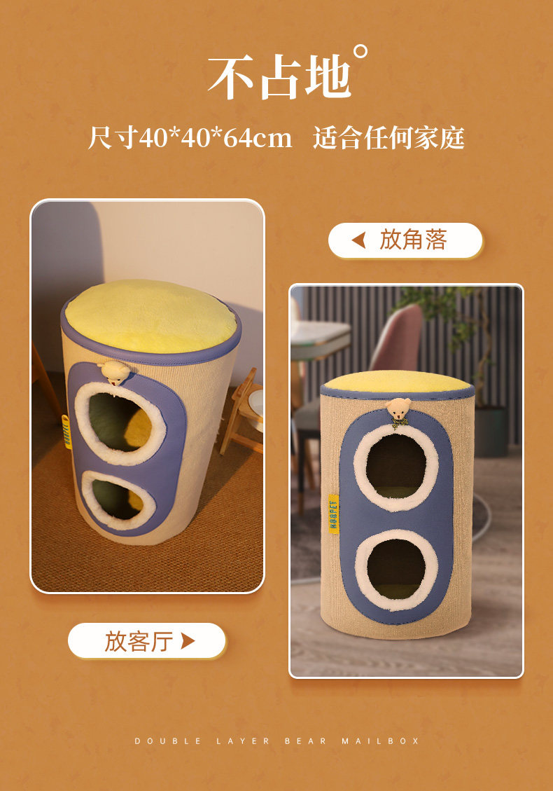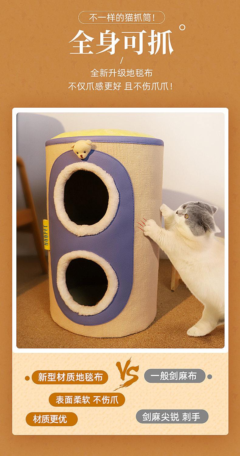 【品名】:HOOPET圆形剑麻猫抓桶/邮筒小熊双层猫窝 S/小熊之家高筒窝爬 S/ 奶茶剑麻桶-(单层/双层)/宠物三层树洞圆筒爬架(米色)