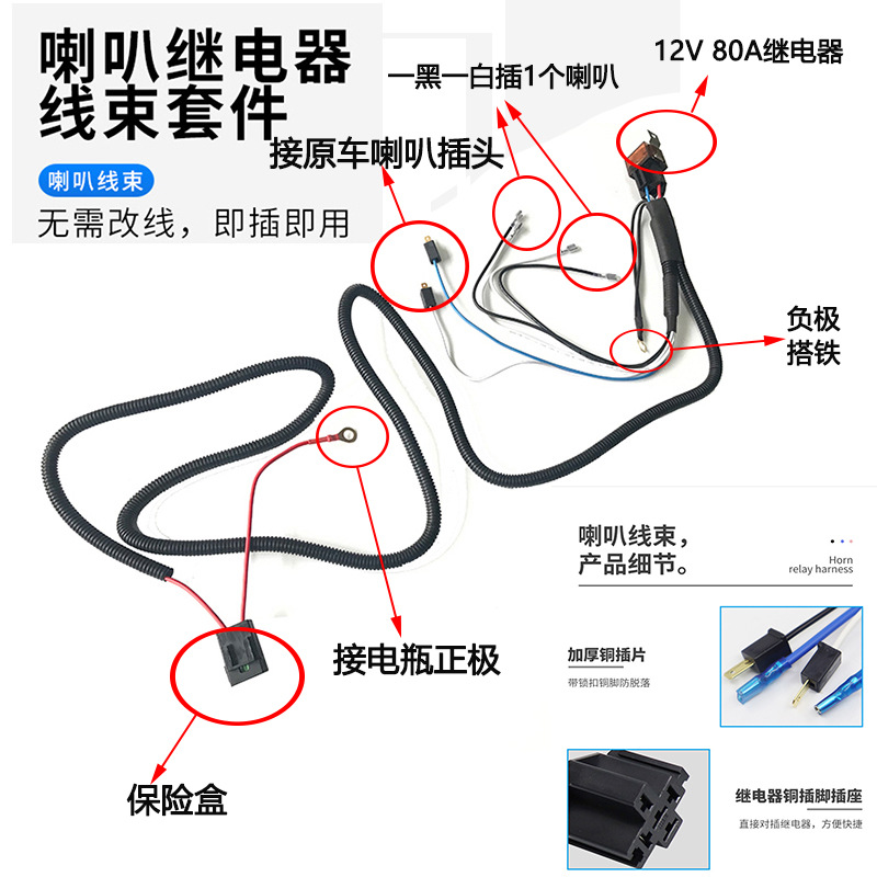 产品名称 :汽车蜗牛喇叭改装线束 材质:纯铜线材,汽车用耐高温,耐腐蚀电线 继电器:(12V 80A) 保险丝:(30A) 电线规格:16号线 电线长度:1.9M 规格:一拖二适用 功率:50W 适用电压:12V 产品重量:180g 包装尺寸:220×50×45mm 装箱规格:41×26×35cm 装箱数:50/箱 包含:继电器,插头,保险
