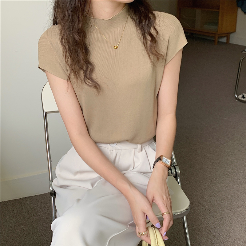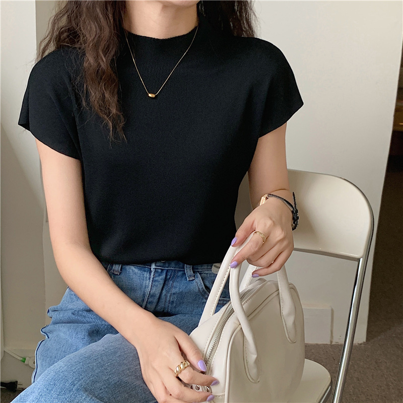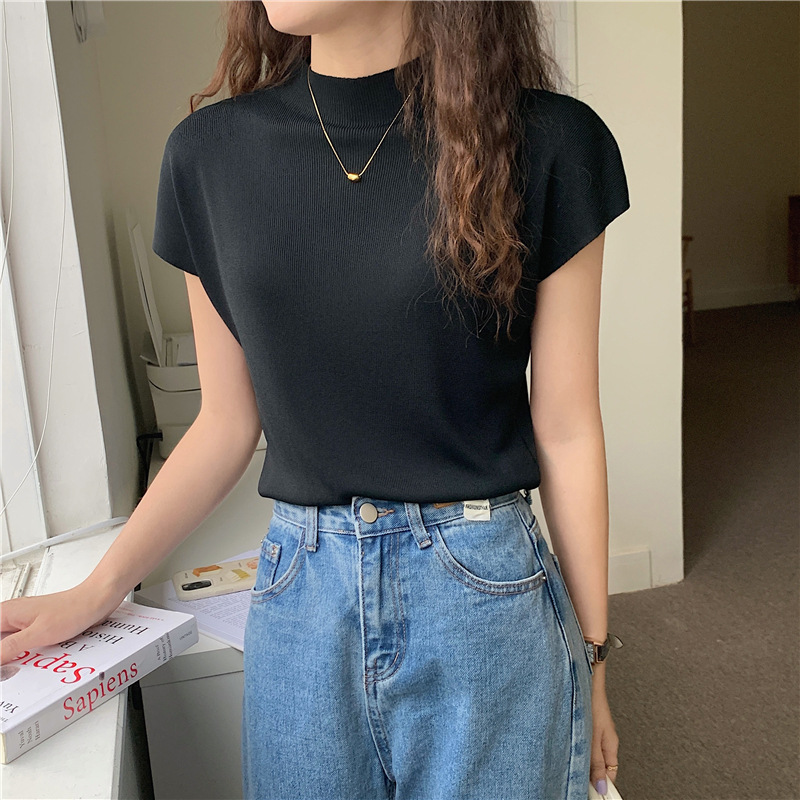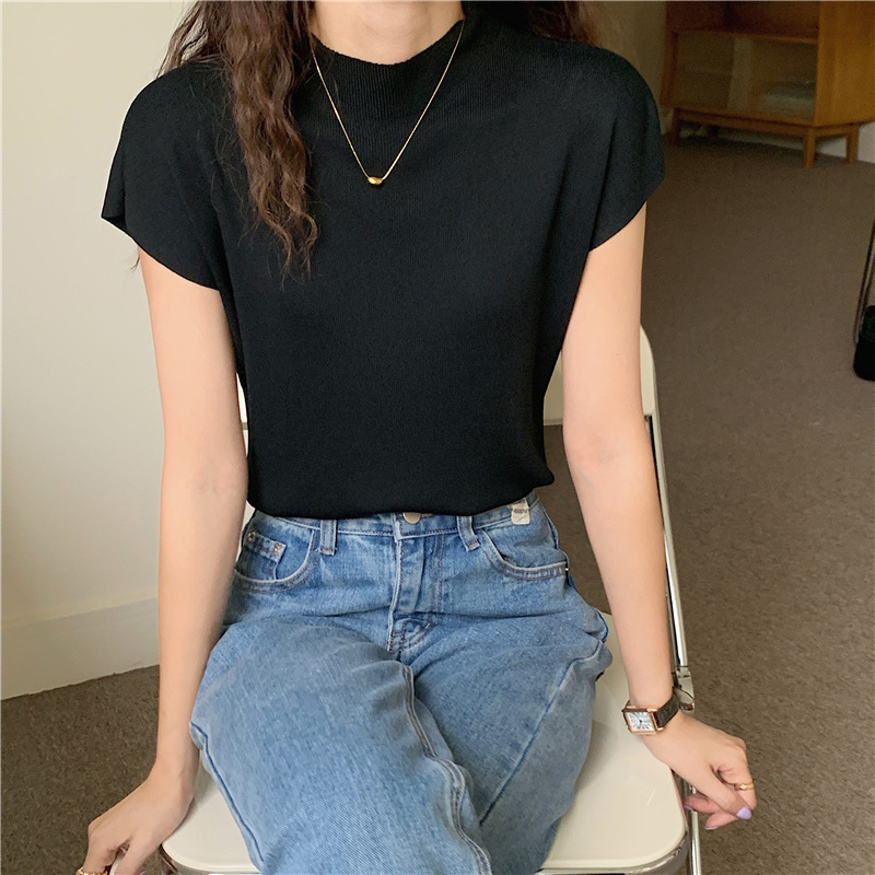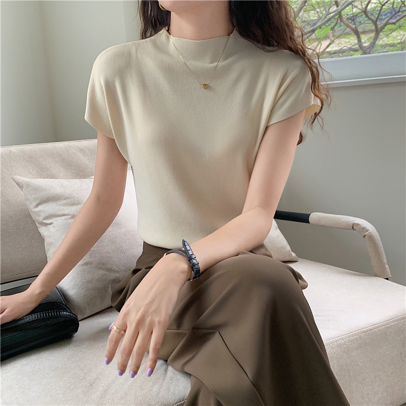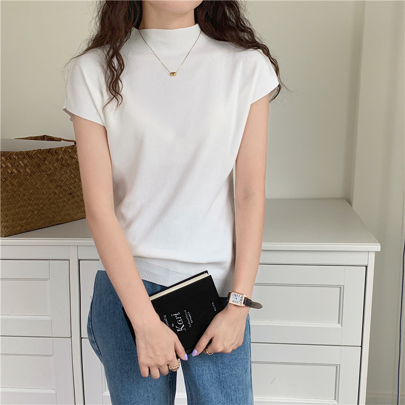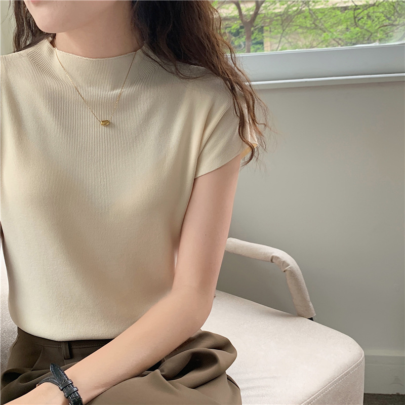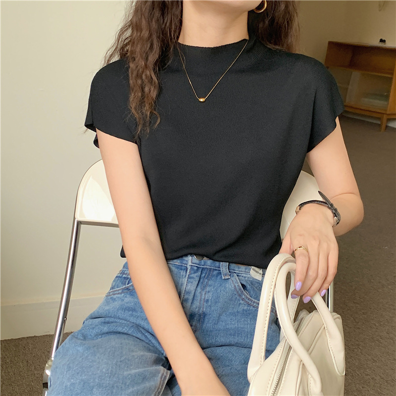 아이스 실크 니트 반팔 탑 여성 하프 하이 칼라 슬림 스웨터 여성용 티셔츠 베이스 아우터 쇼트 여름