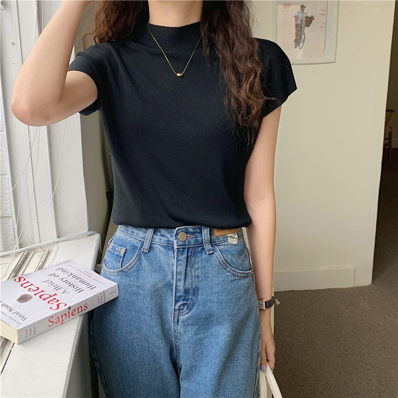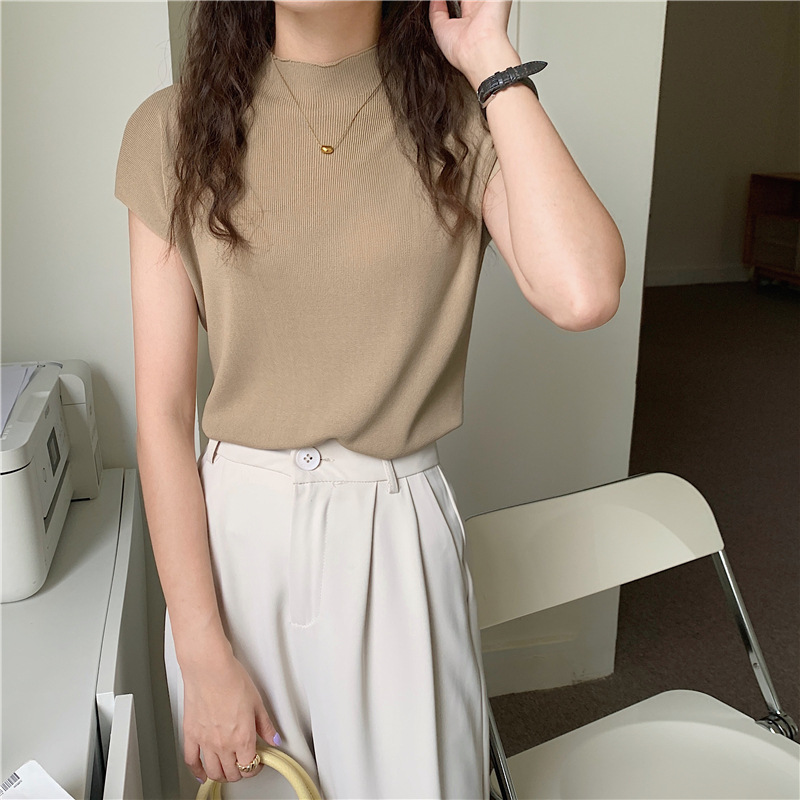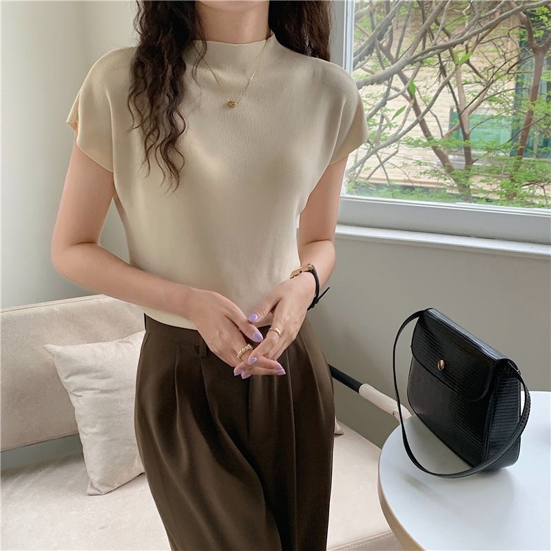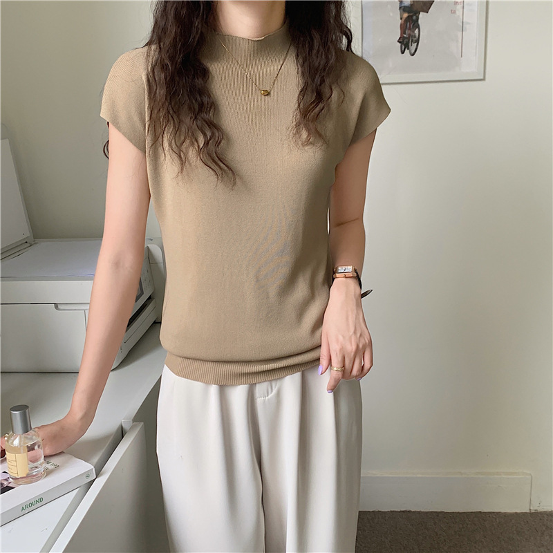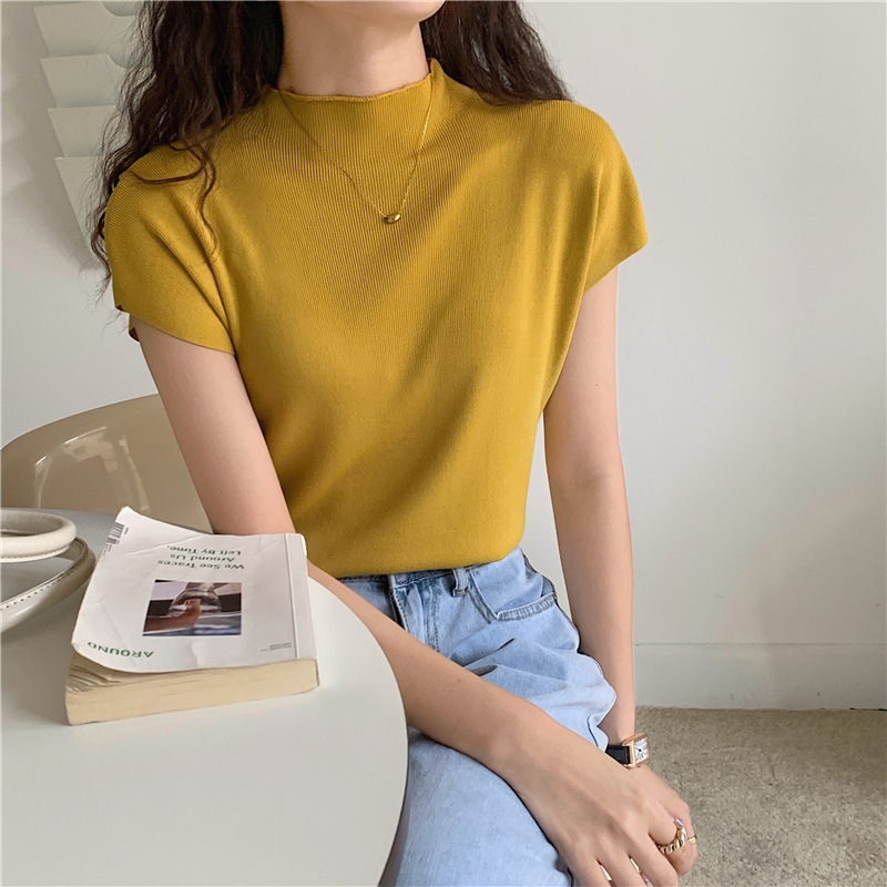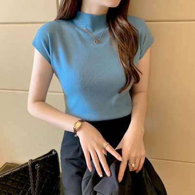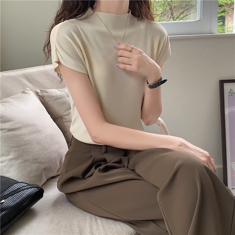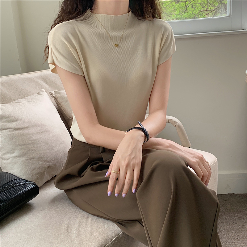 아이스 실크 니트 반팔 탑 여성 하프 하이 칼라 슬림 스웨터 여성용 티셔츠 베이스 아우터 쇼트 여름