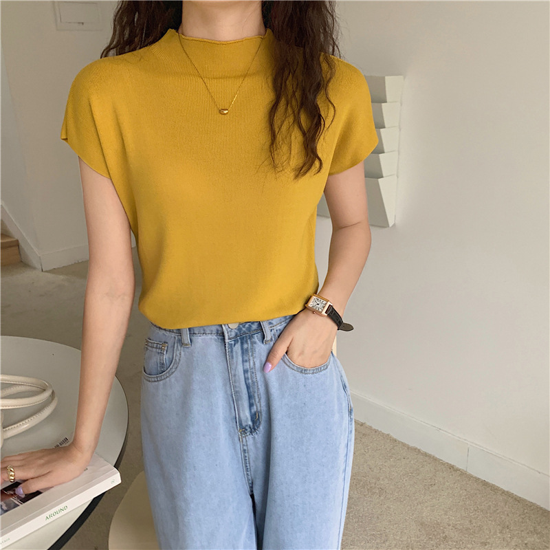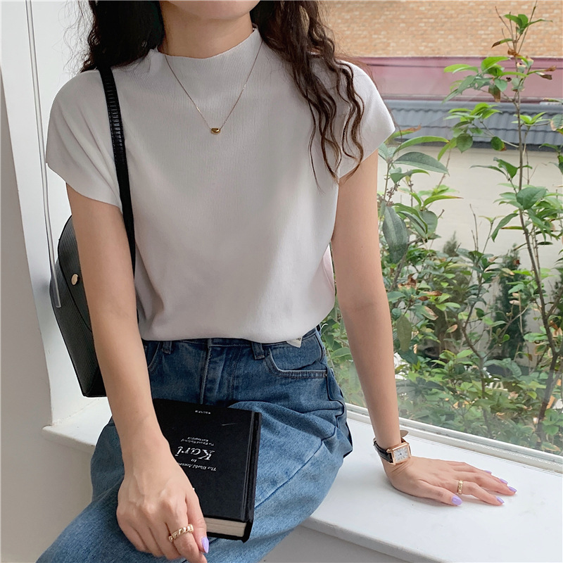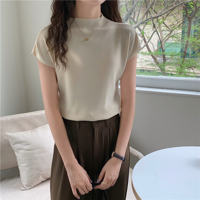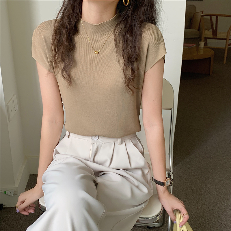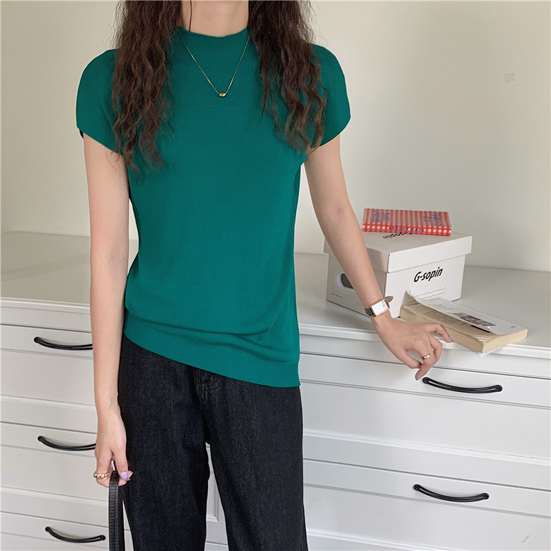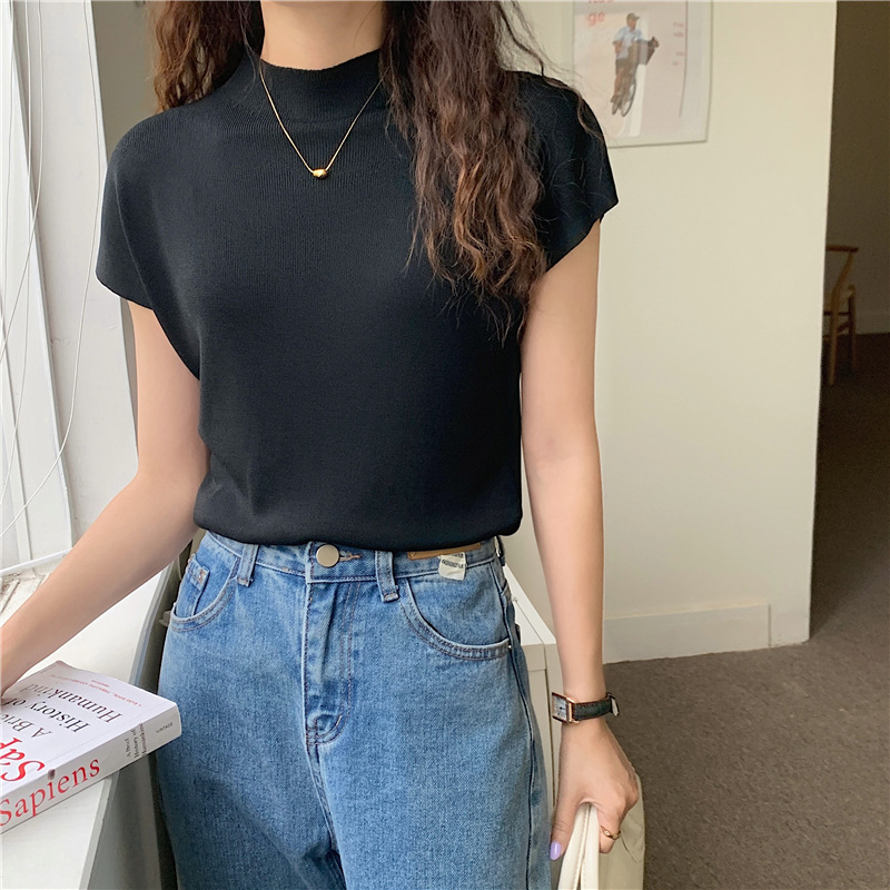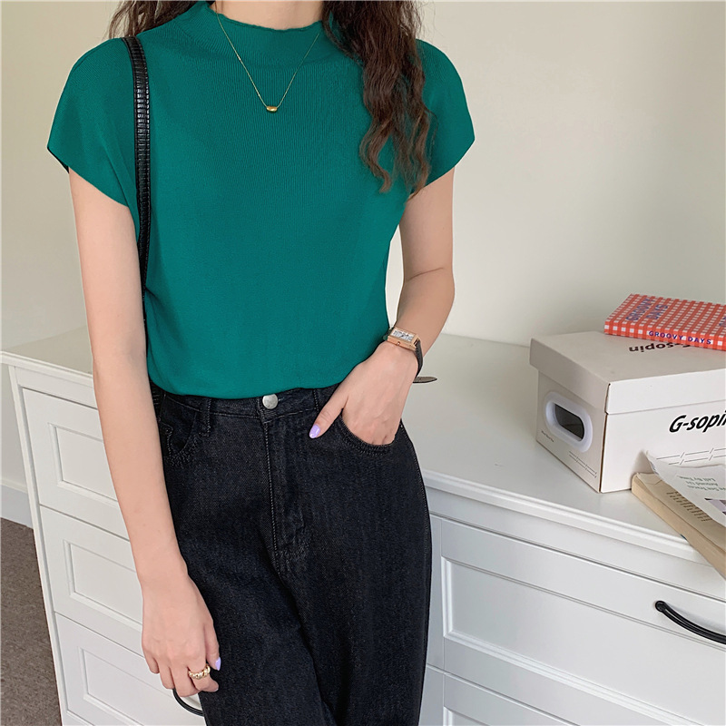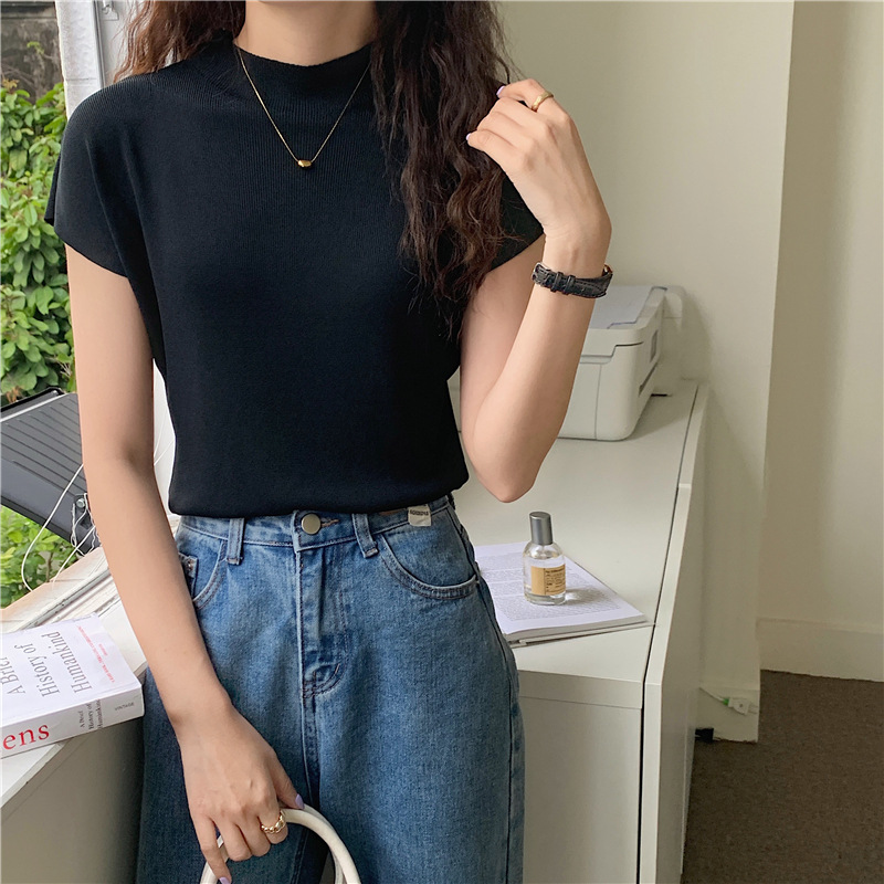아이스 실크 니트 반팔 탑 여성 하프 하이 칼라 슬림 스웨터 여성용 티셔츠 베이스 아우터 쇼트 여름