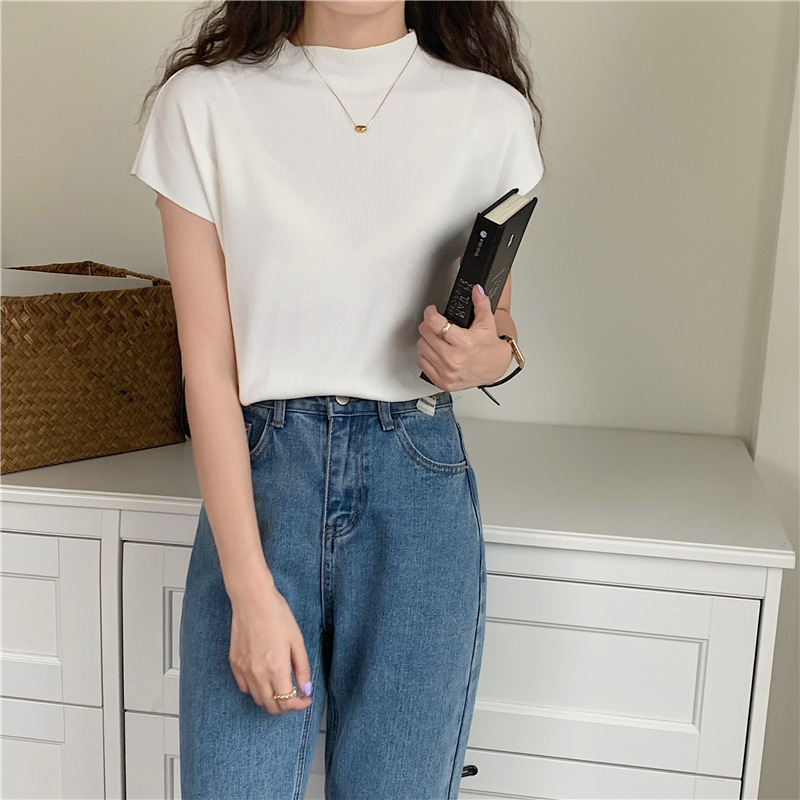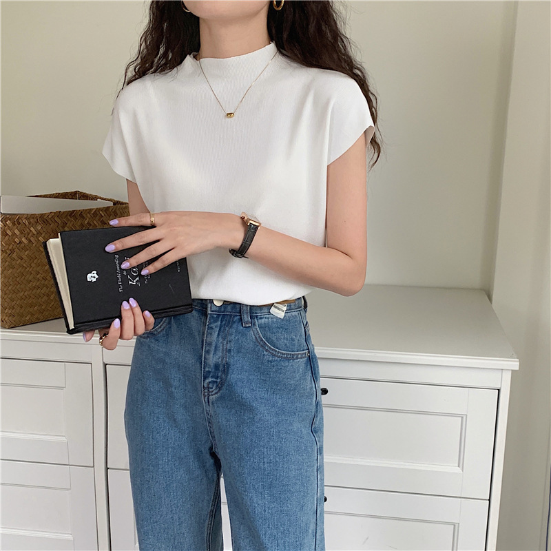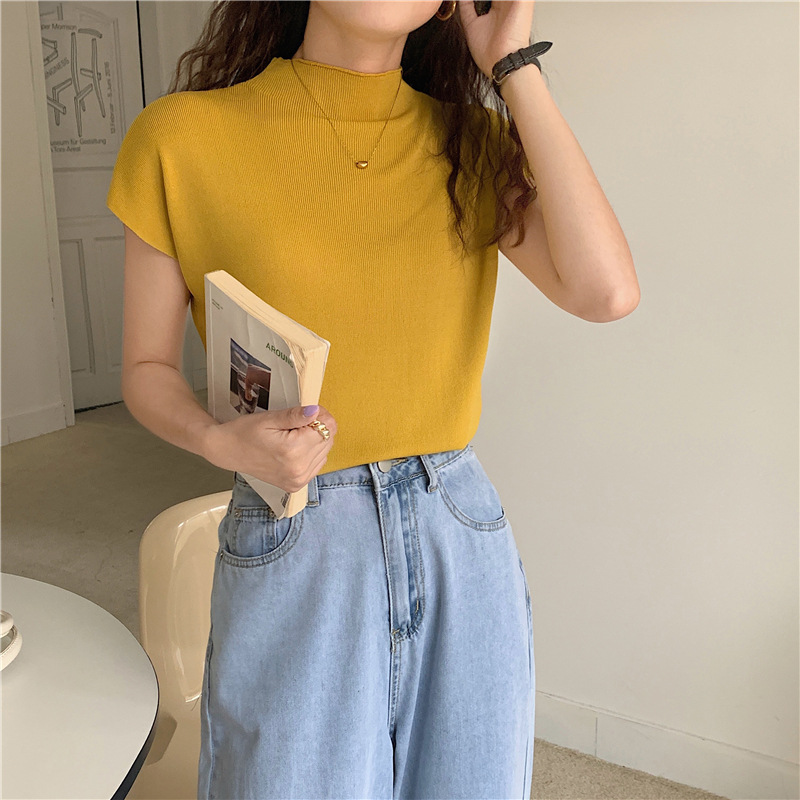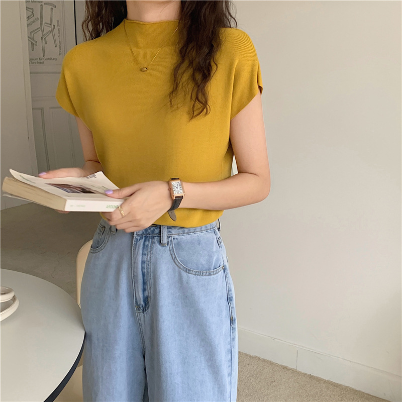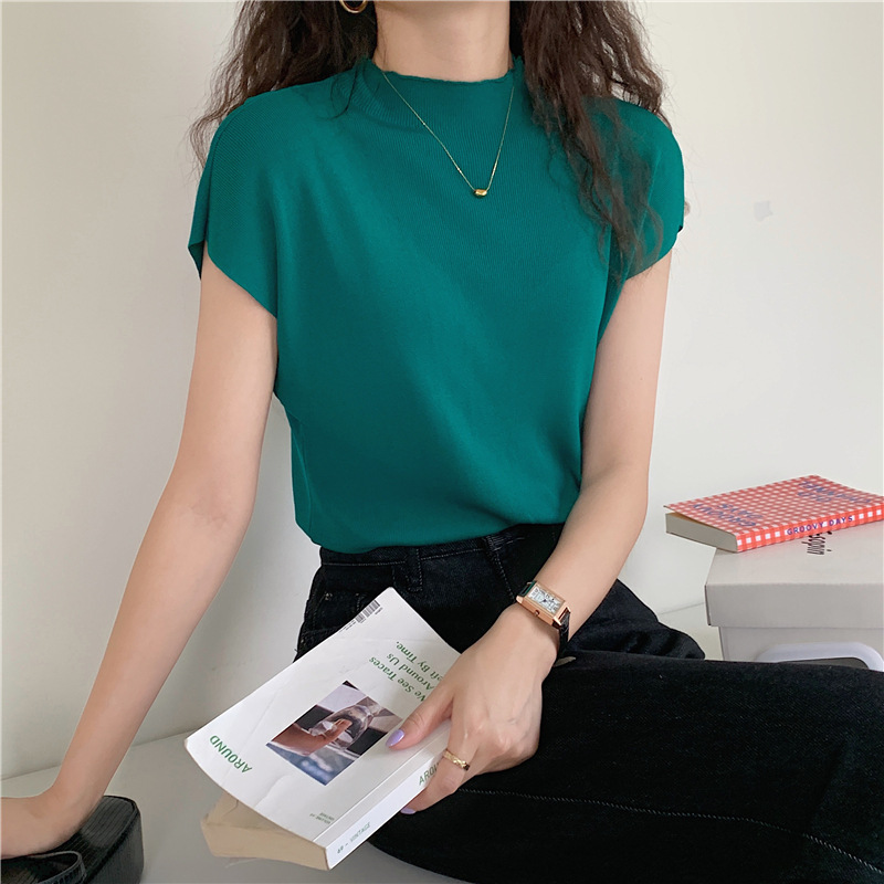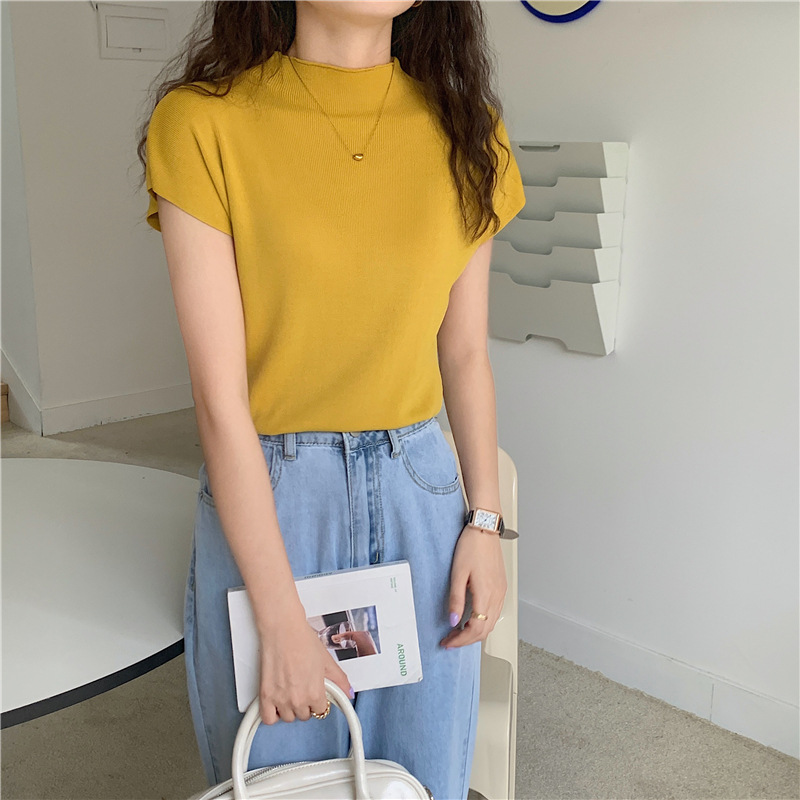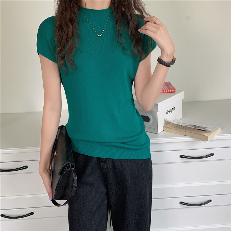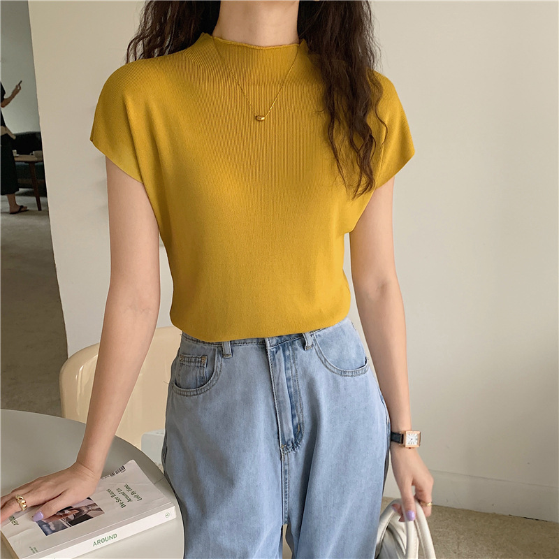 아이스 실크 니트 반팔 탑 여성 하프 하이 칼라 슬림 스웨터 여성용 티셔츠 베이스 아우터 쇼트 여름