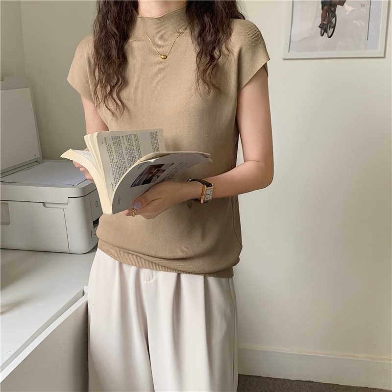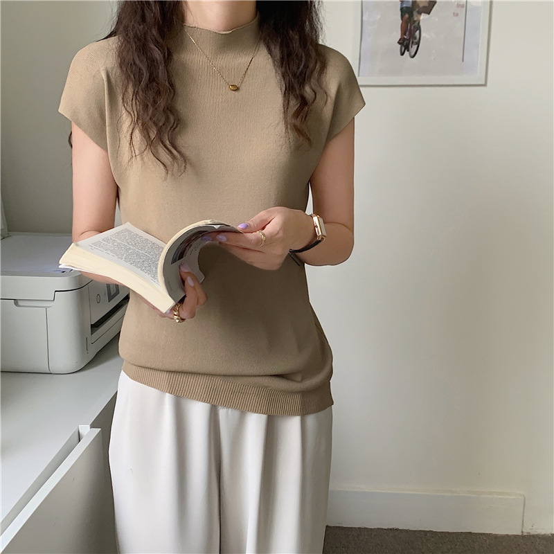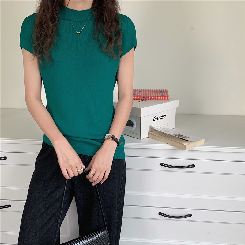 아이스 실크 니트 반팔 탑 여성 하프 하이 칼라 슬림 스웨터 여성용 티셔츠 베이스 아우터 쇼트 여름스토어 가기