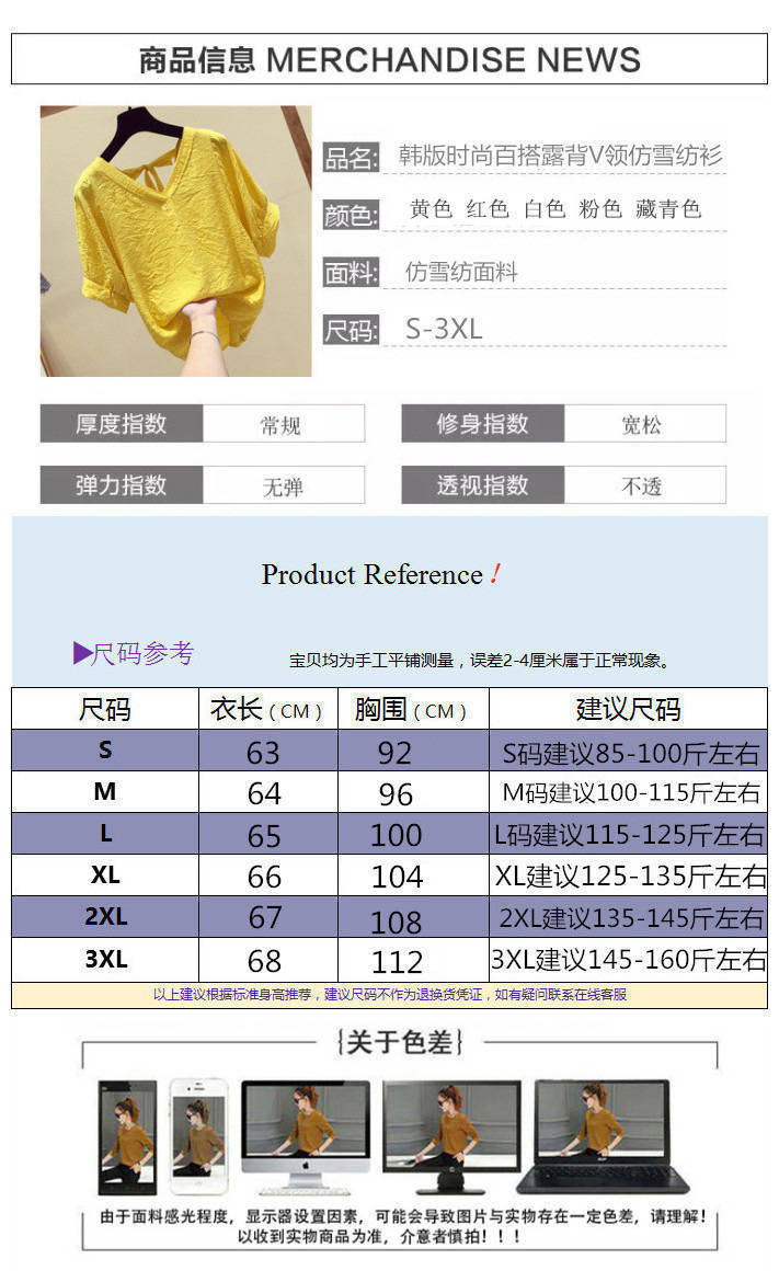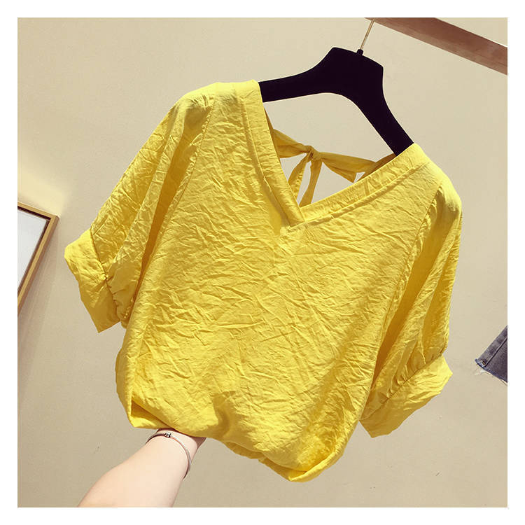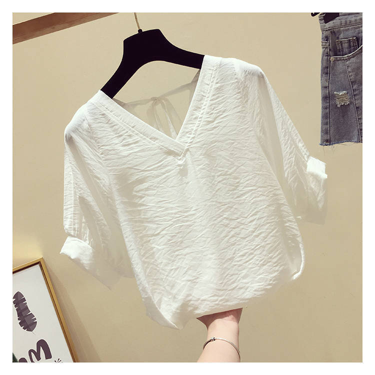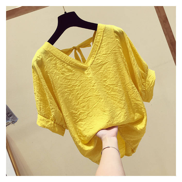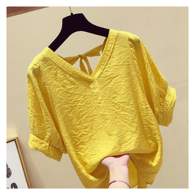 V-넥 등이없는 쉬폰 셔츠 여성용 반팔 2023 새로운 한국 스타일 슈퍼 페어리 달콤한 느슨한 슬림 배꼽 커버 탑 트렌디