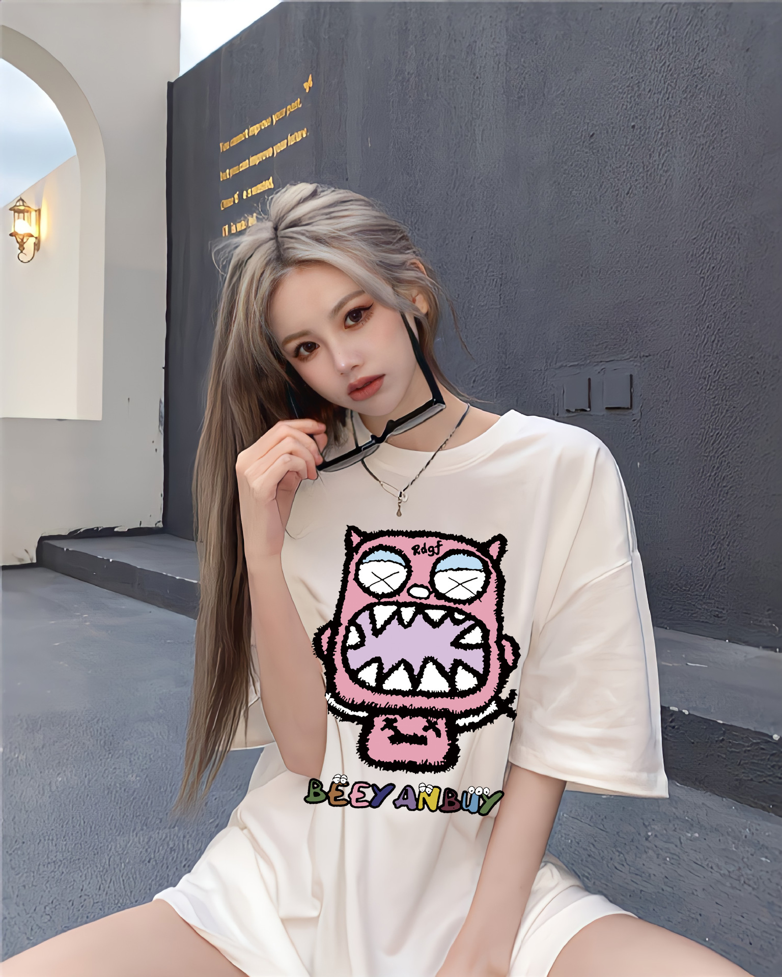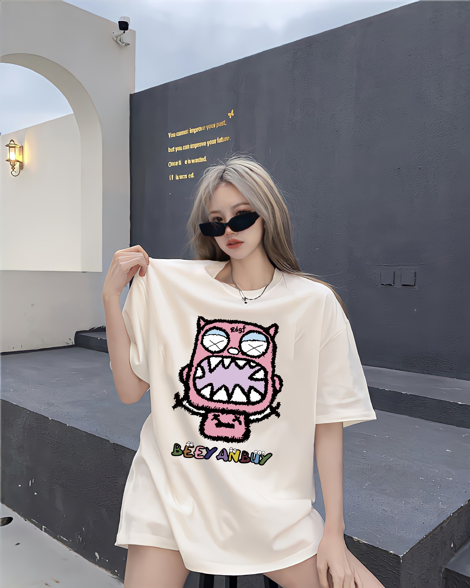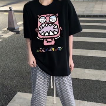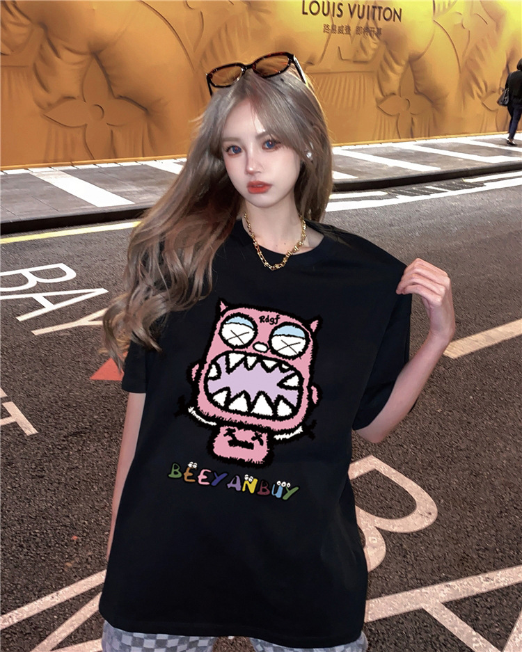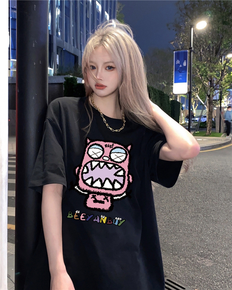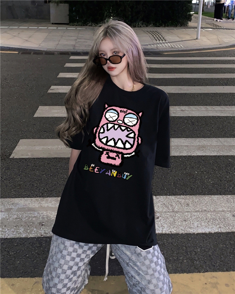 디자인 센스 레트로 재미있는 인쇄 반팔 티셔츠 여성용 여름 새로운 루즈한 모든 매치 캐주얼 중간 길이 탑 인스토어 가기