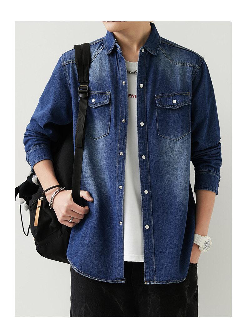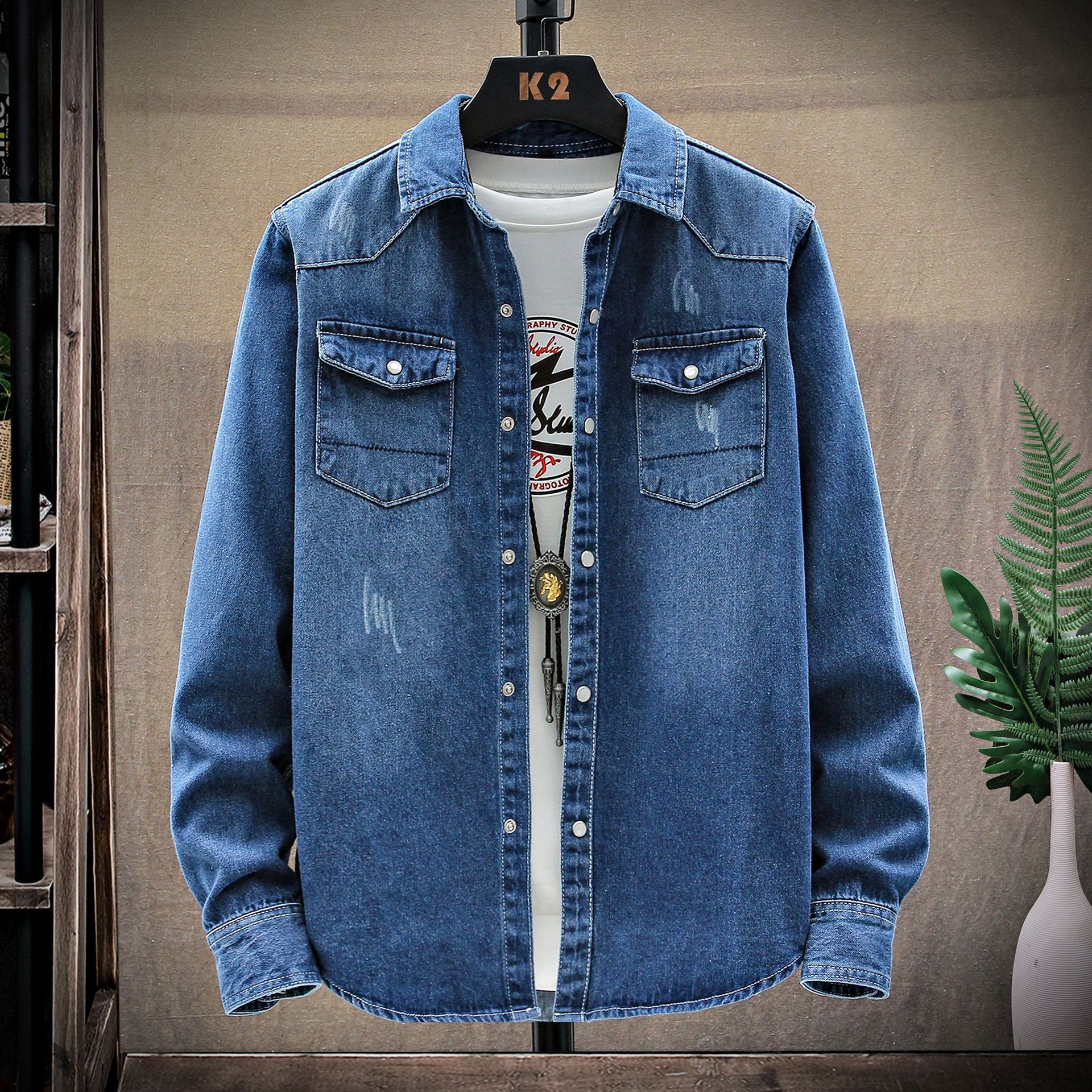 대외 무역 씻어 심플 조커 긴 소매 데님 셔츠 2023 봄과 가을 청소년 한국 슬림 핏 셔츠 남성 코트