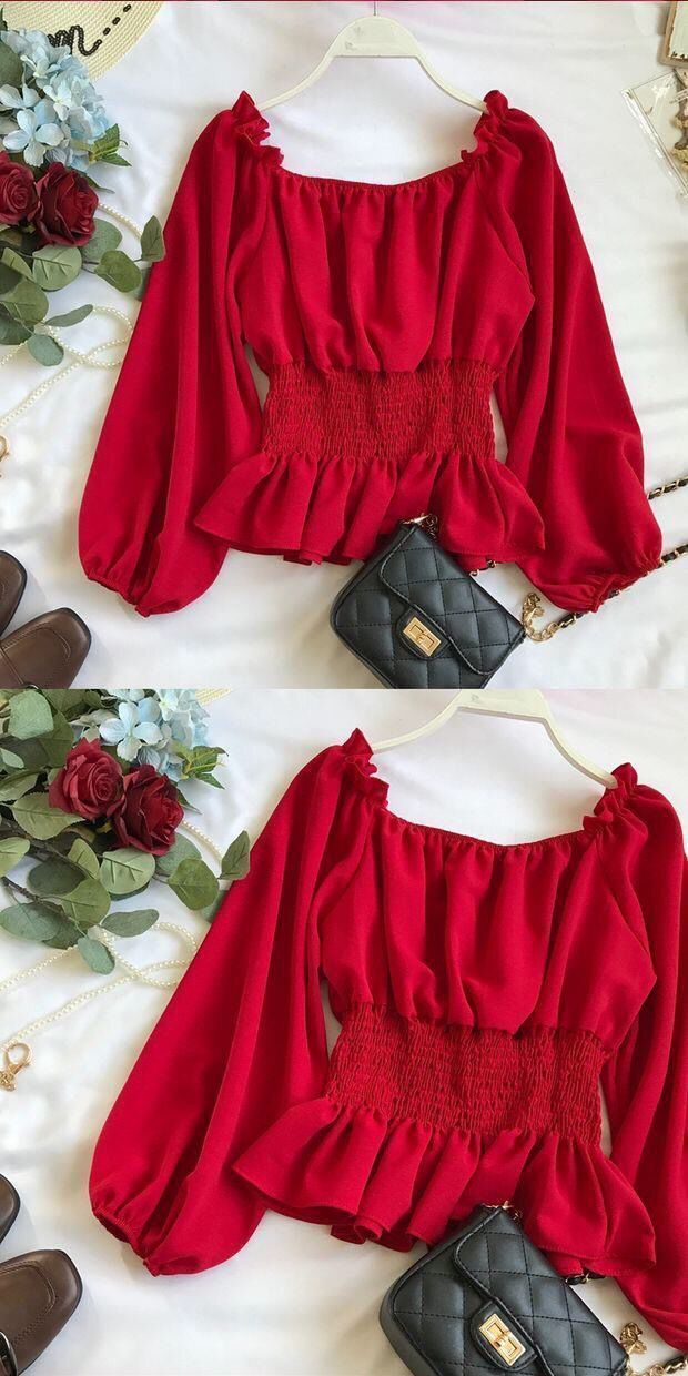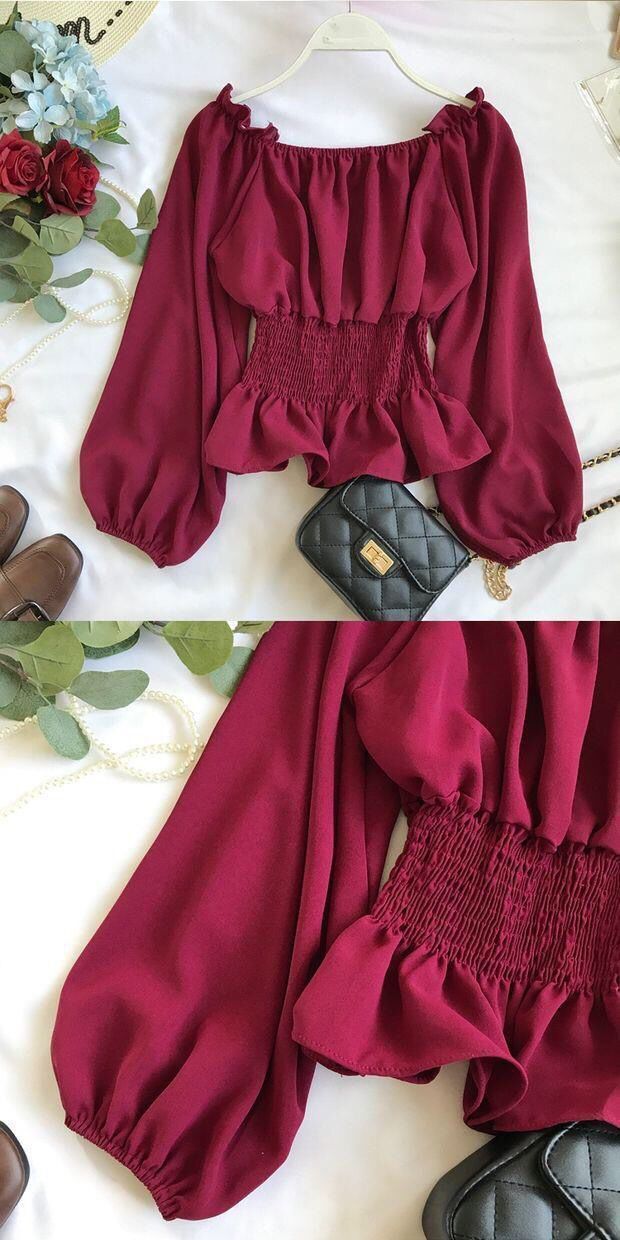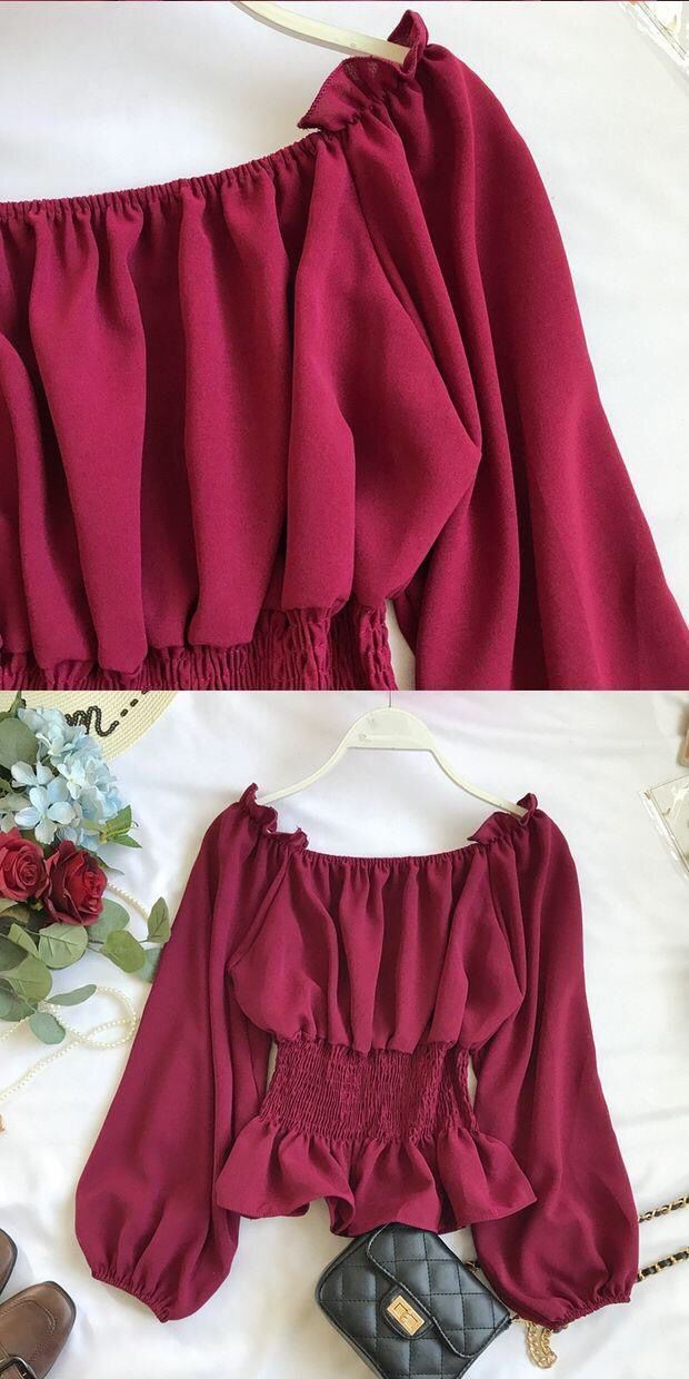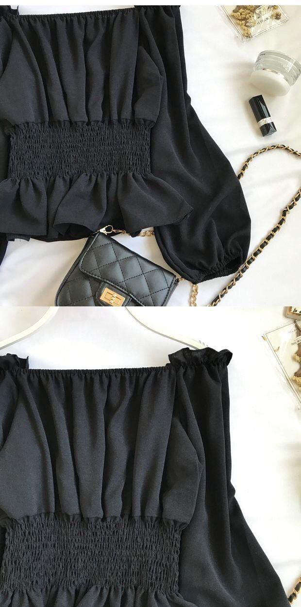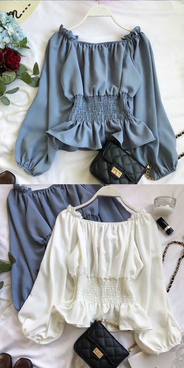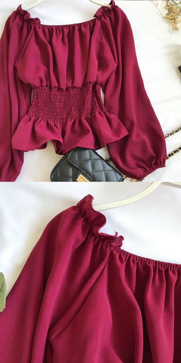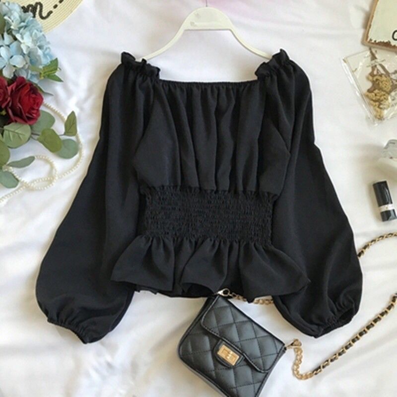긴팔 쉬폰 셔츠 여성용 오프 숄더 봄과 가을 한국식 허리 슬리밍 러플 셔츠 숏베이스 탑스토어 가기