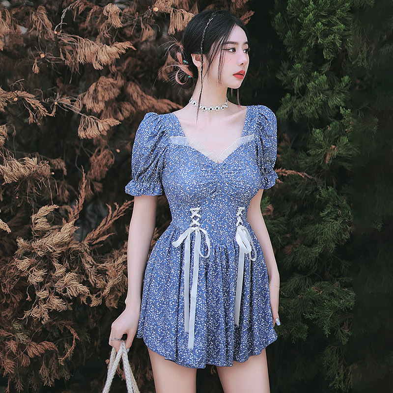 꽃무늬 원피스 수영복 여성용 스커트 스타일, 한국과 일본의 레트로 스타일, 허리를 잘록하게 잡아주는 슬리밍 효과, 플러스 사이즈, 온천 수영복, 슬림핏