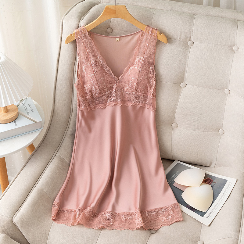 새로운 봄과 여름 프랑스 잠옷 여자의 섹시한 벨트 가슴 패드 얼음 실크 조끼 단색 슬링 잠옷 V-넥 가정 의류