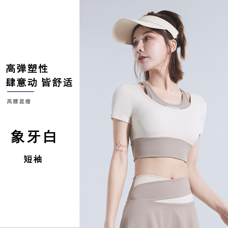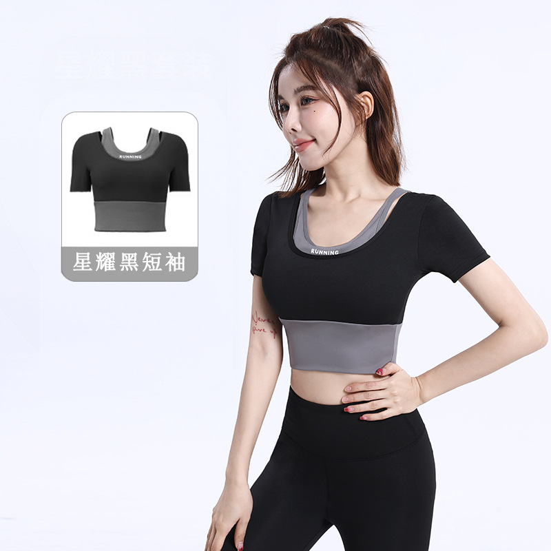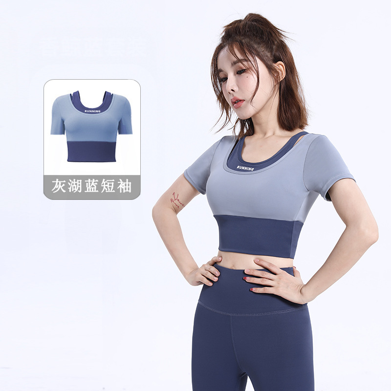 신제품 원피스 요가 반팔 브라 프리 요가 의류 컬러 매칭 가짜 투피스 속건 슬리밍 타이트 피트니스 의류스토어 가기