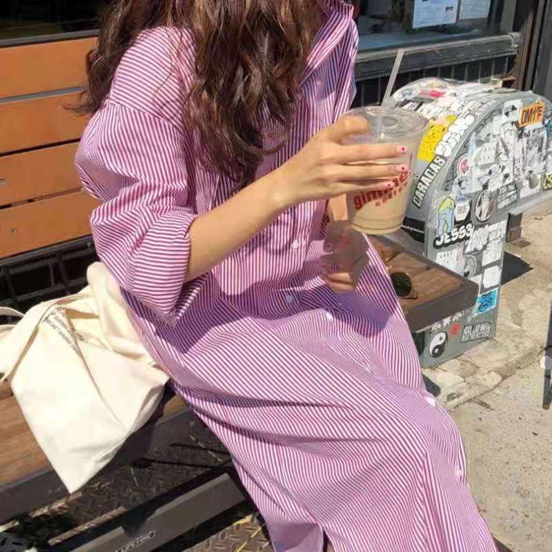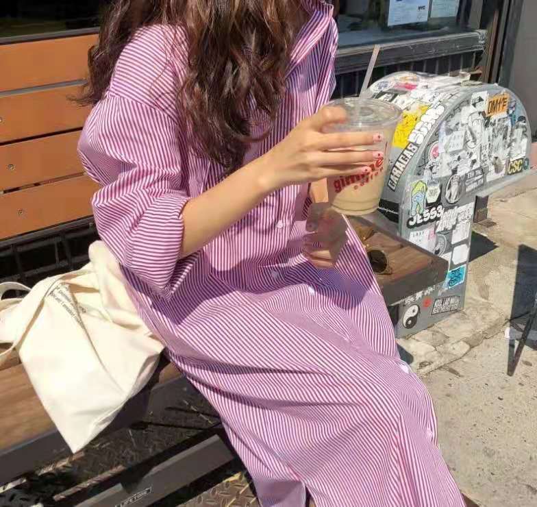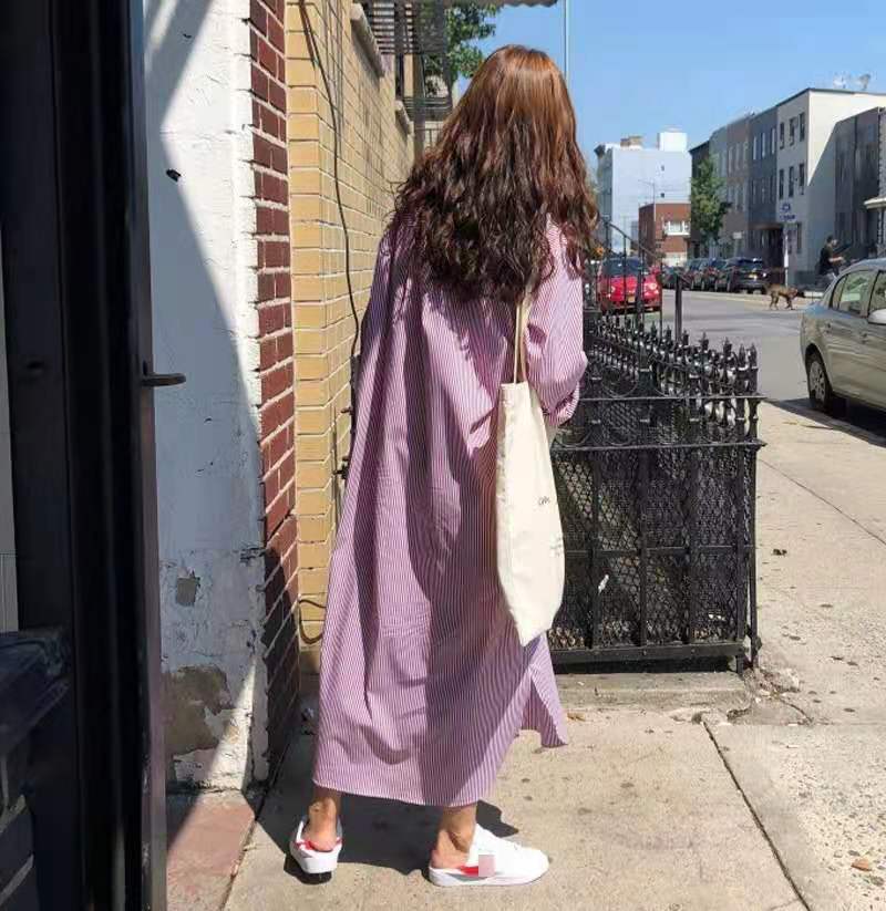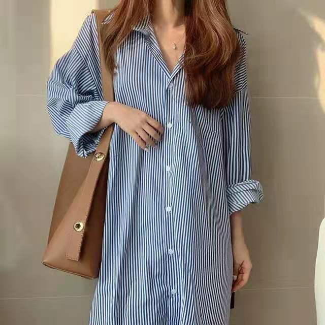2025 새로운 봄, 가을 여성 한국 스타일 캐주얼 휴가 대형 루즈한 게으른 스타일 긴팔 스트라이프 셔츠 드레스스토어 가기