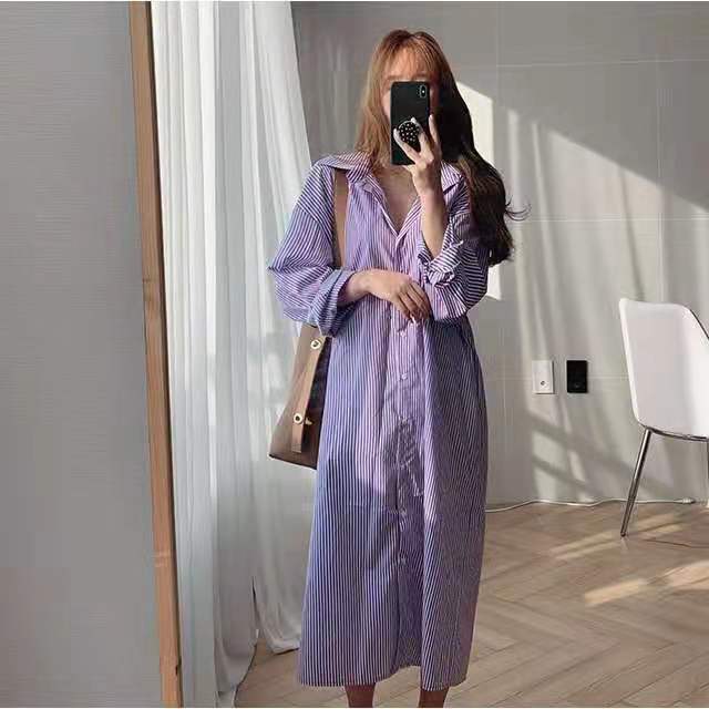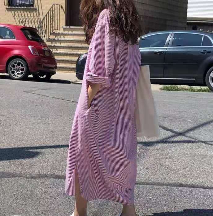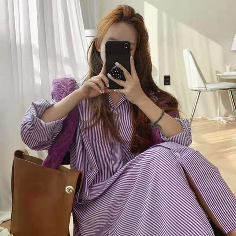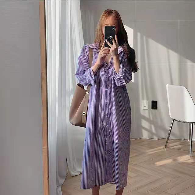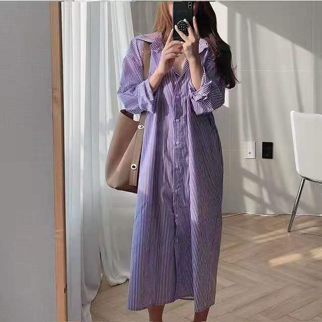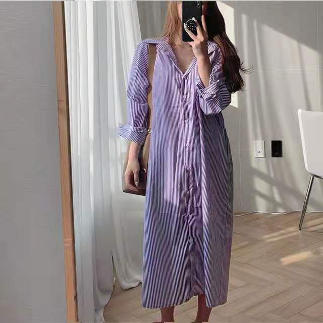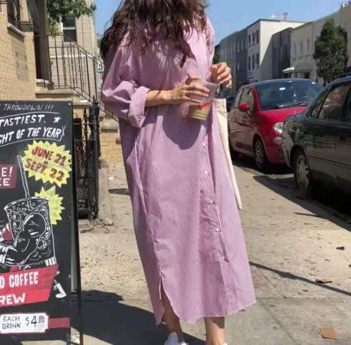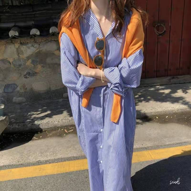 2025 새로운 봄, 가을 여성 한국 스타일 캐주얼 휴가 대형 루즈한 게으른 스타일 긴팔 스트라이프 셔츠 드레스