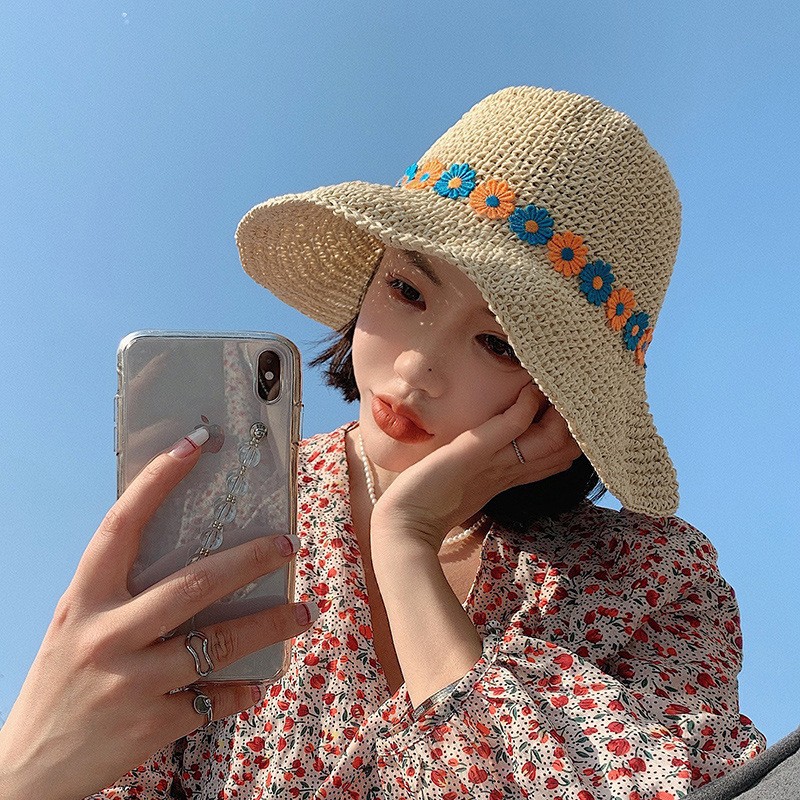 한국 수제 밀짚 모자 여자의 일본 스타일 신선한 태양 모자 봄 여름 여행 자외선 차단제 모자 달콤한 모리 스타일 모든 매치
