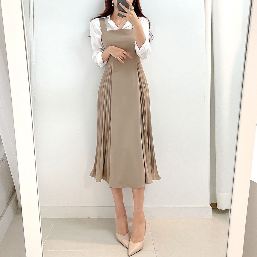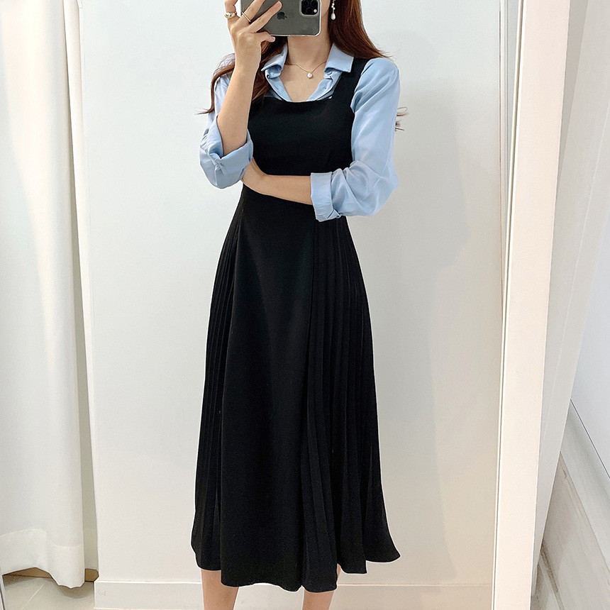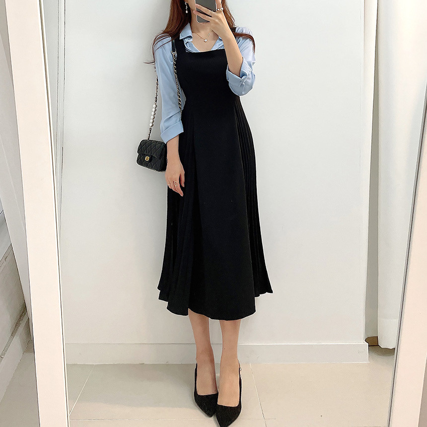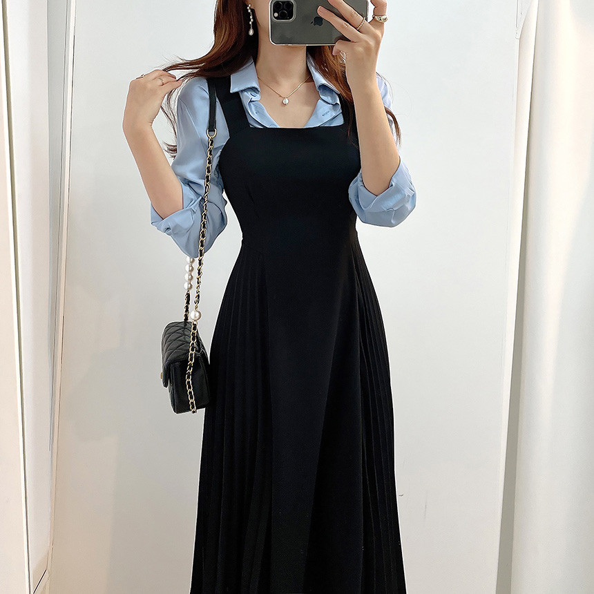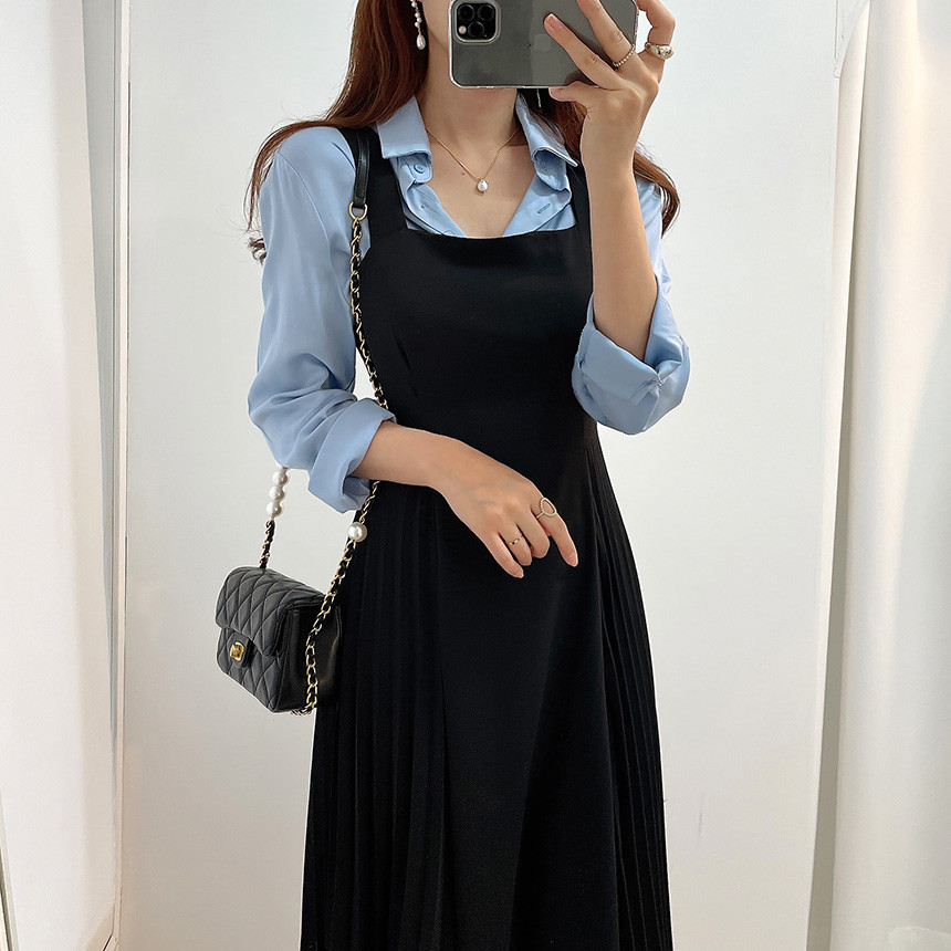 한국 세련된 초가을 프랑스 옷깃 레이스업 패션 셔츠 + 중간 길이 스트랩 원피스 여성용 투피스 세트스토어 가기