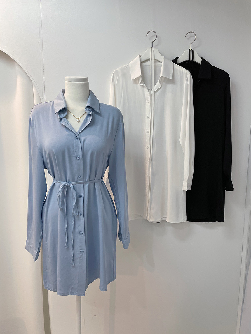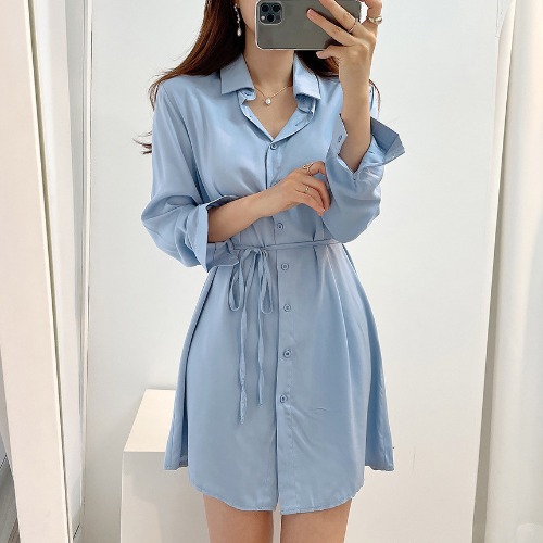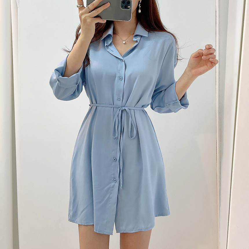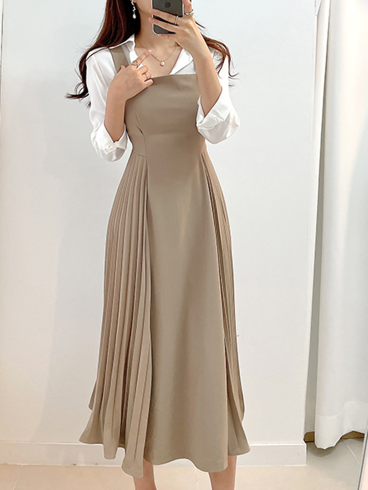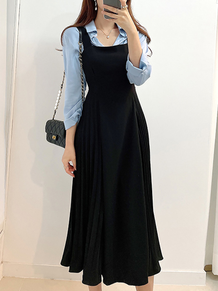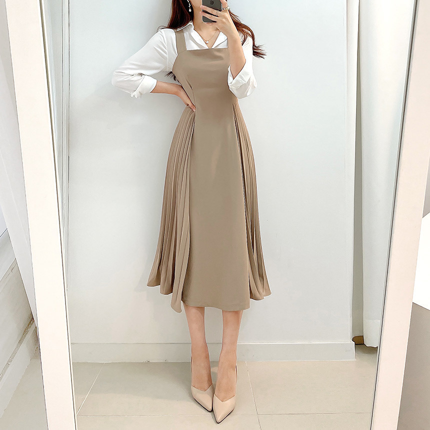 한국 세련된 초가을 프랑스 옷깃 레이스업 패션 셔츠 + 중간 길이 스트랩 원피스 여성용 투피스 세트스토어 가기