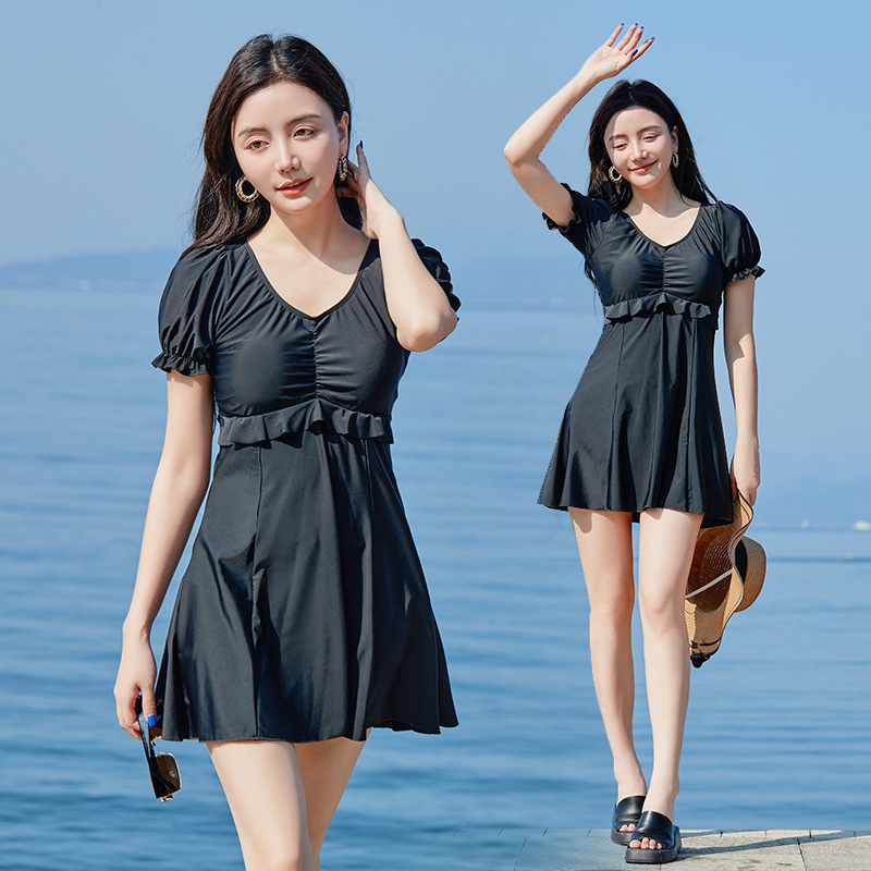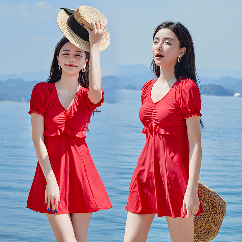 여름 수영복 도매 숙녀 V-넥 반팔 하이 웨이스트 원피스 수영복 수영 웨딩 비치 스커트 재고 도매스토어 가기