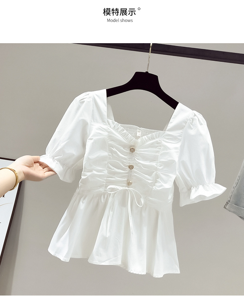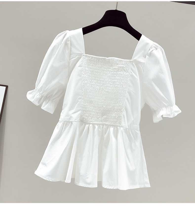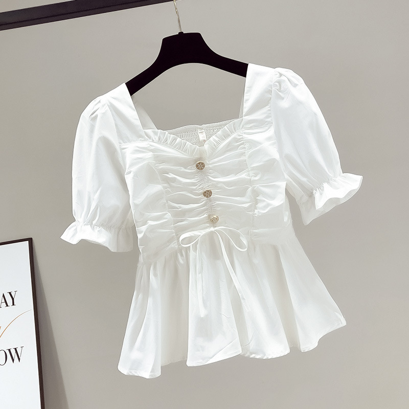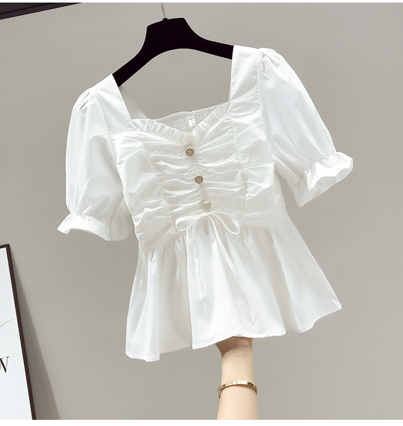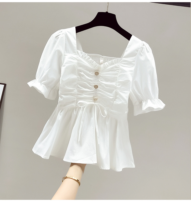반팔 쉬폰 화이트 셔츠 여성용 여름 얇은 2022 새로운 배꼽 덮개 허리 작은 셔츠 스퀘어 칼라 슬림 탑