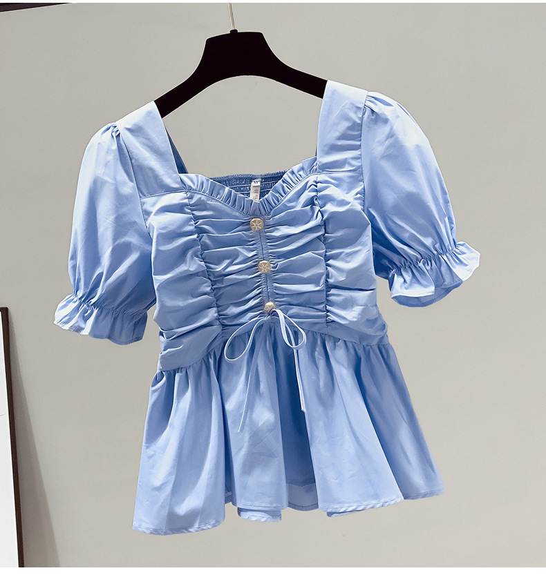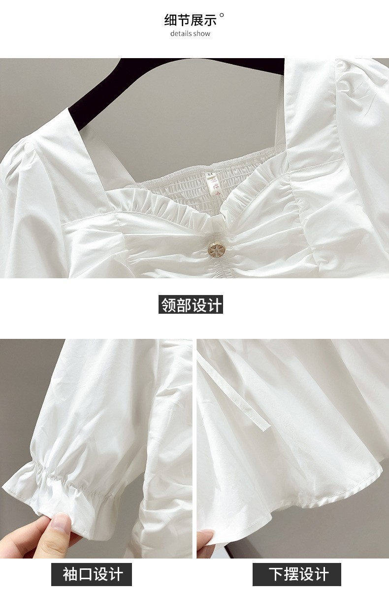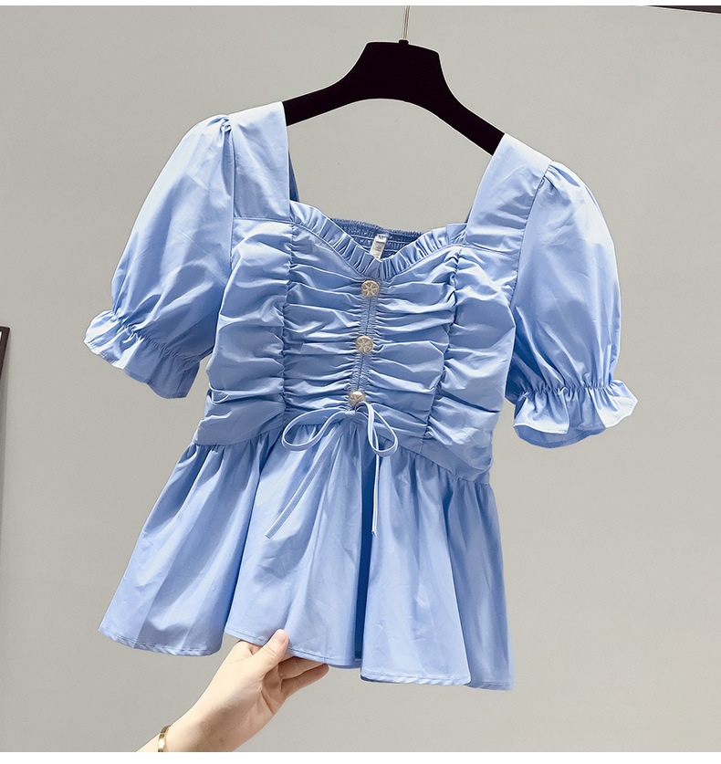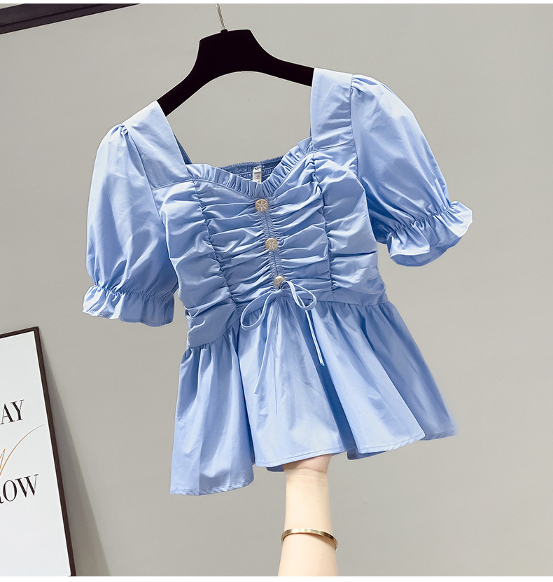 반팔 쉬폰 화이트 셔츠 여성용 여름 얇은 2022 새로운 배꼽 덮개 허리 작은 셔츠 스퀘어 칼라 슬림 탑