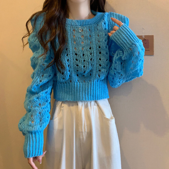 디자인 센스 틈새 중공 짧은 니트 스웨터 탑 이른 가을 부드러운 스타일 여성을위한 프랑스 우아한 퍼프 슬리브 스웨터