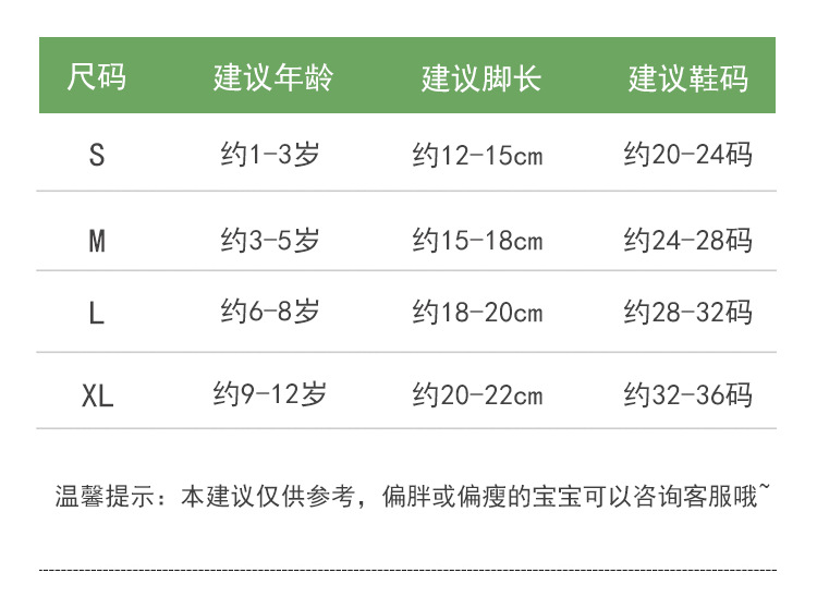 • XL 사이즈는 발 길이 20-22cm, 대략 9-12세 아동에게 적합합니다.