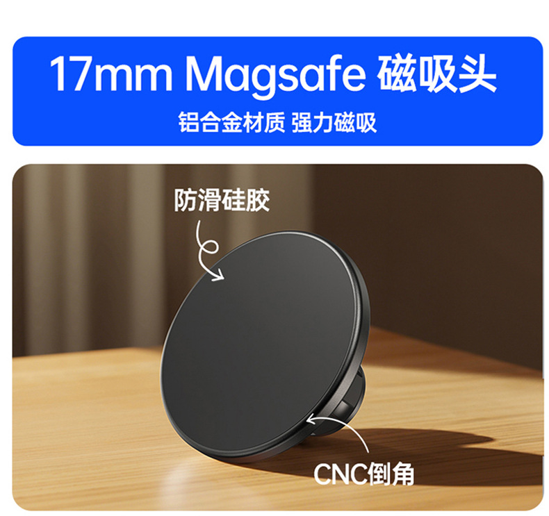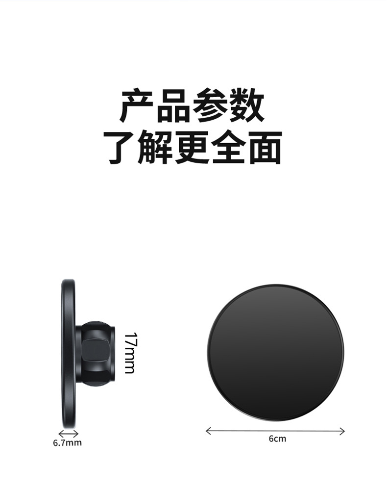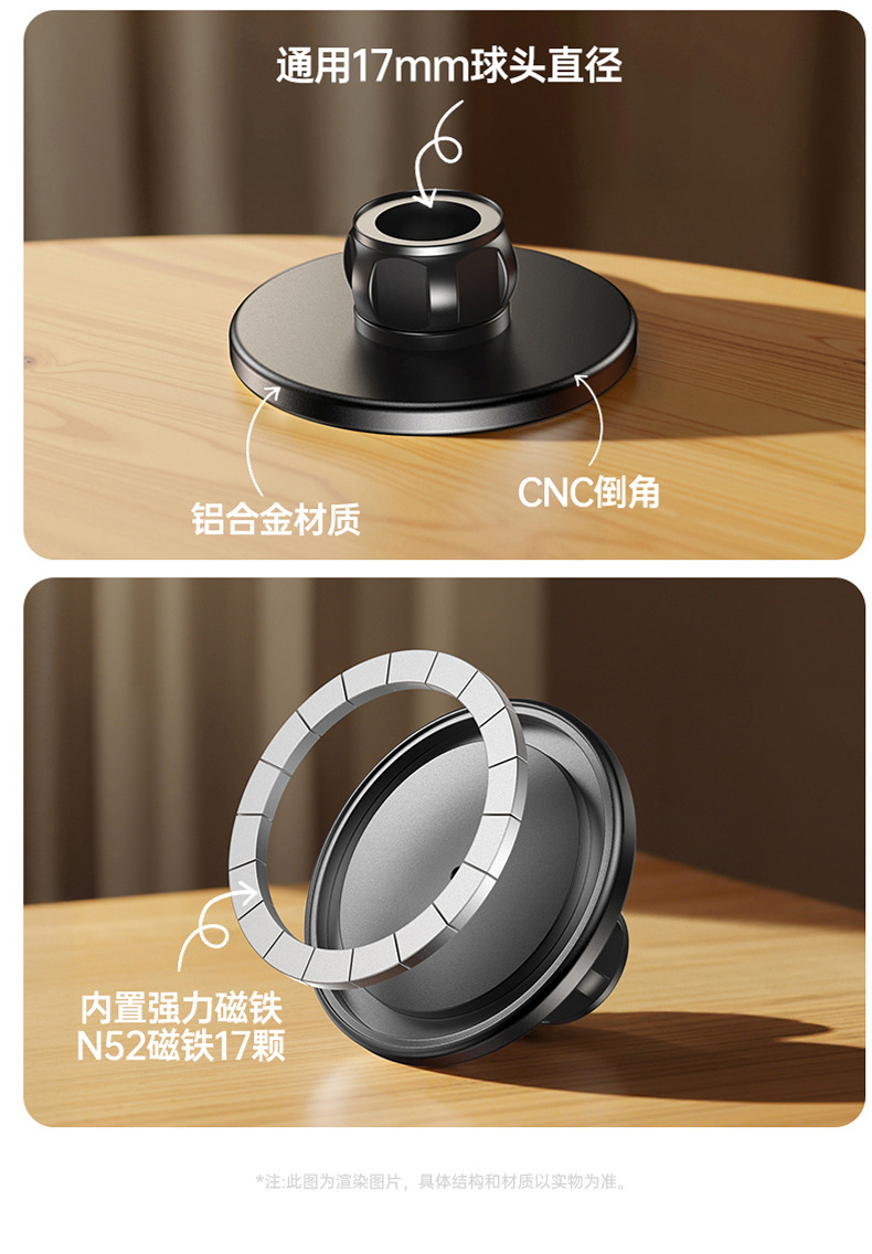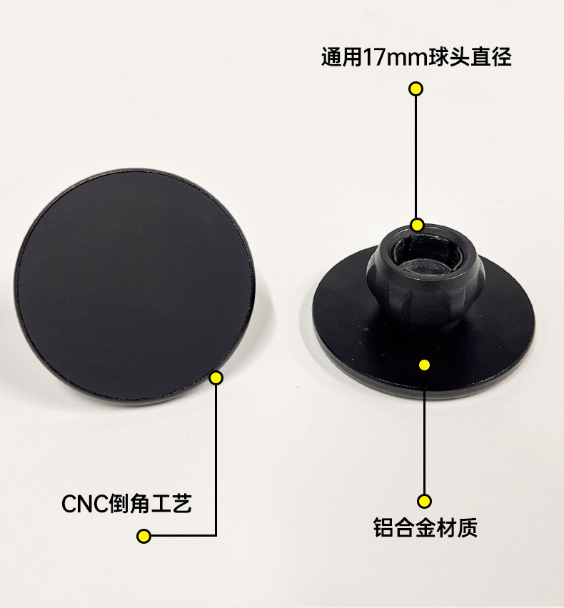 本产品采用高标号铝合金,CNC机加工处理,精密度高,外观喷砂氧化工艺,更具数码产品质感。采用N52高强磁铁,配套通用17mm球头通用底座+螺母,广泛适用车载手机、桌面支架等系列。