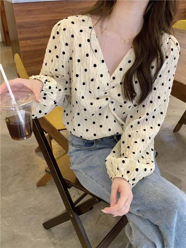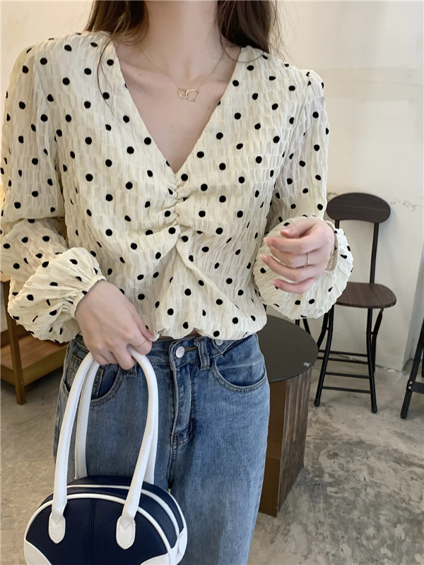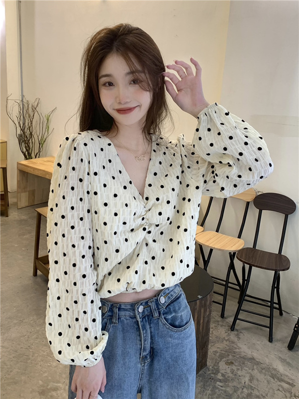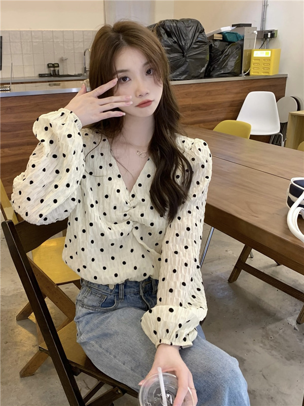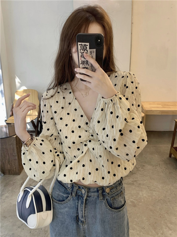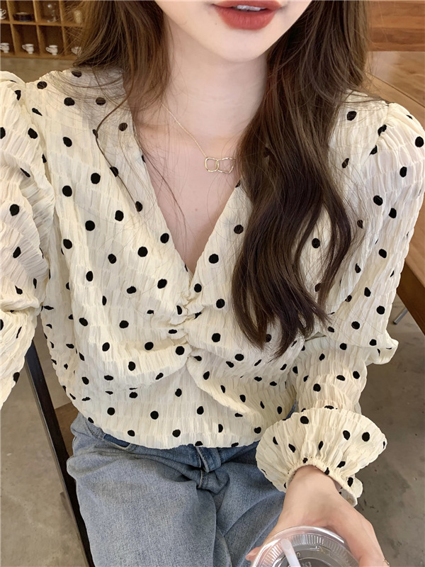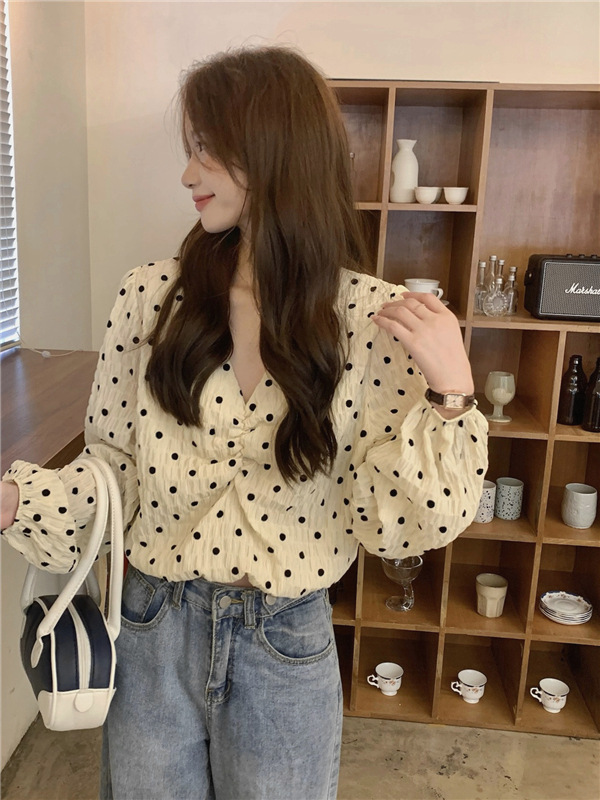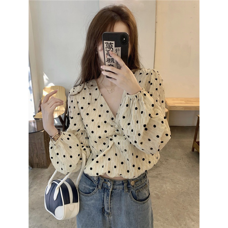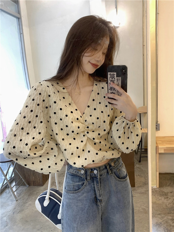 진짜 가격! 디자인 센스 달콤한 V-넥 폴카 도트 긴 소매 셔츠 여성용 레트로 프랑스 퍼프 슬리브 짧은 탑