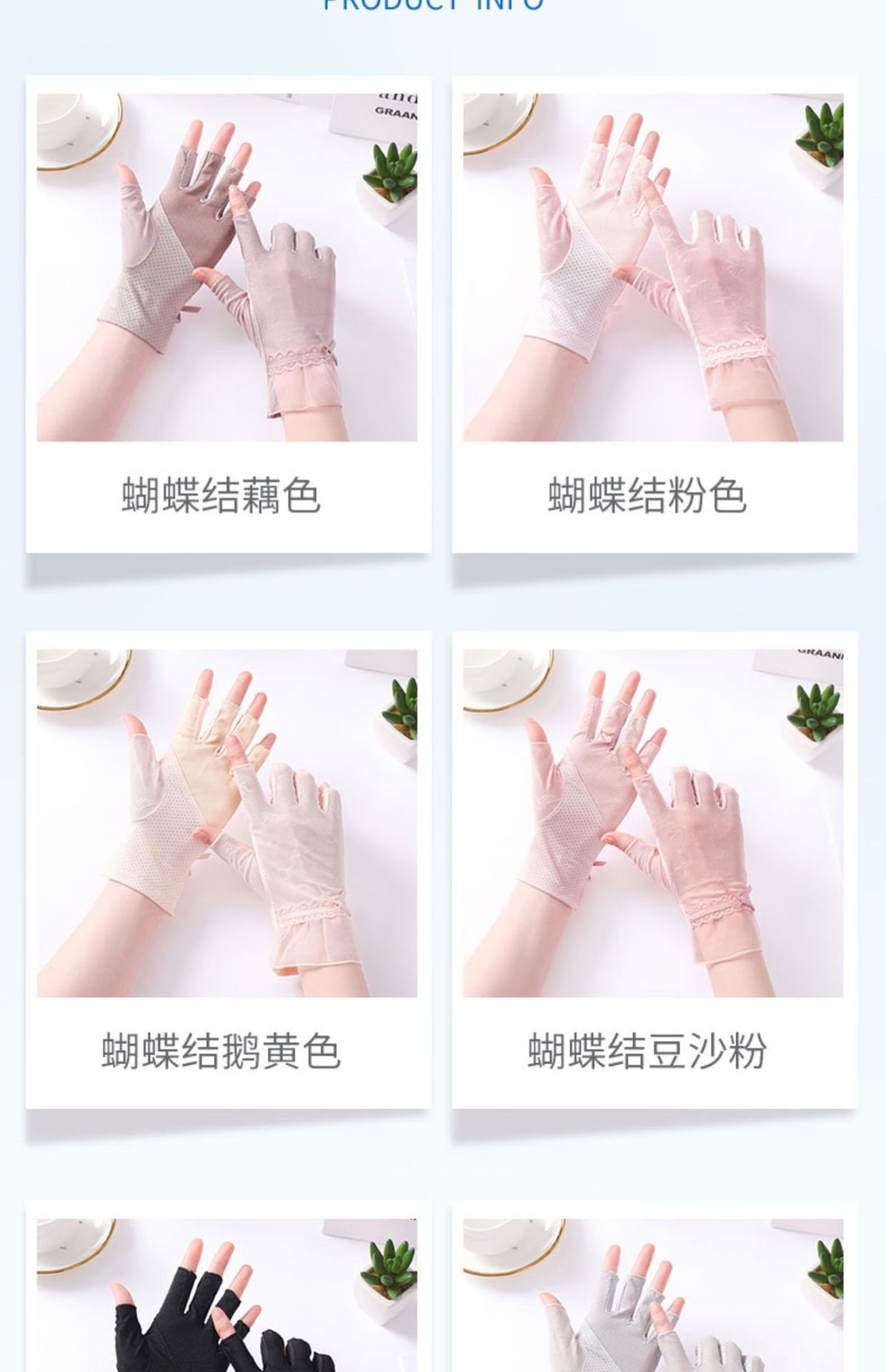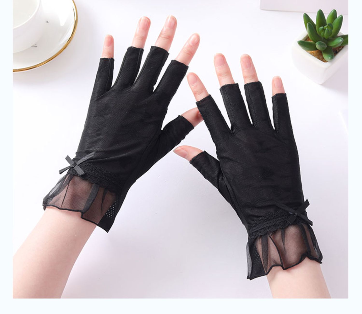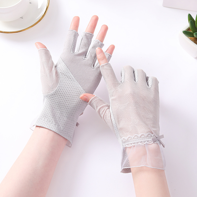 여성용 반 손가락 얼음 실크 얇은 자외선 차단 장갑 여름 핑거리스 운전 및 사이클링 미끄럼 방지 통기성 레이스 매니큐어 핸드 가드