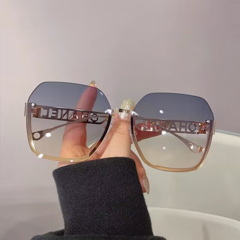 女款时尚无框切边太阳镜金属字母镂空镜腿潮流欧美大气显脸小墨镜