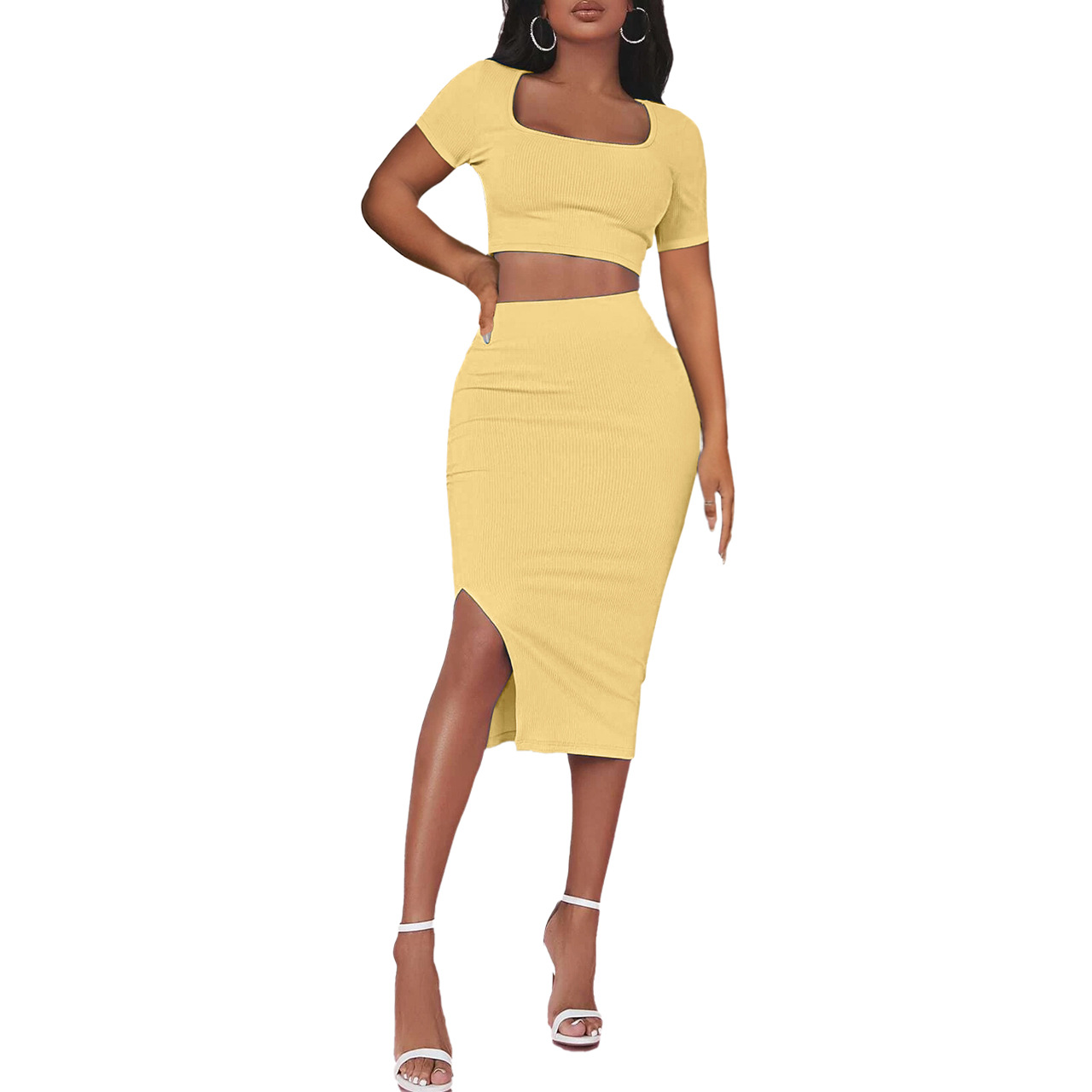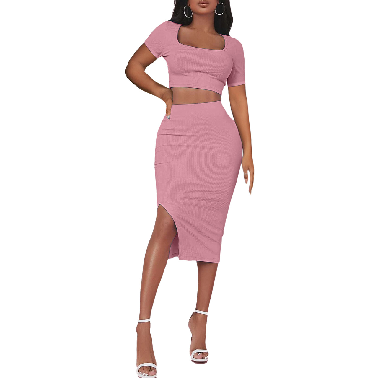 2023년 유럽 및 미국 여성복 아마존 봄 여름 골지 스퀘어넥 반팔 슬릿 스커트 슬림핏 투피스 세트 패셔너블스토어 가기
