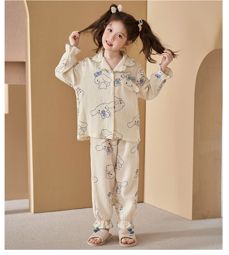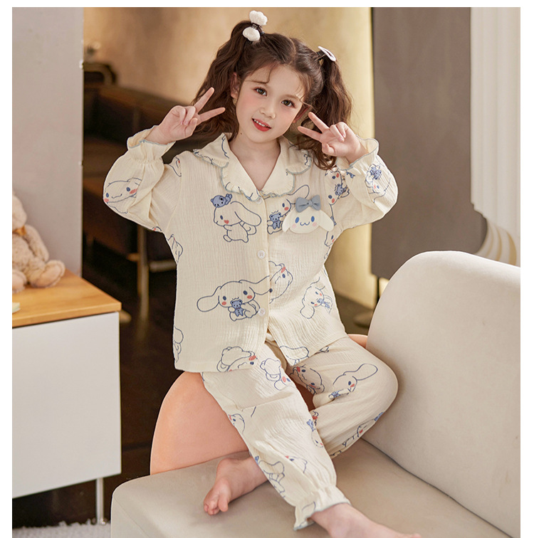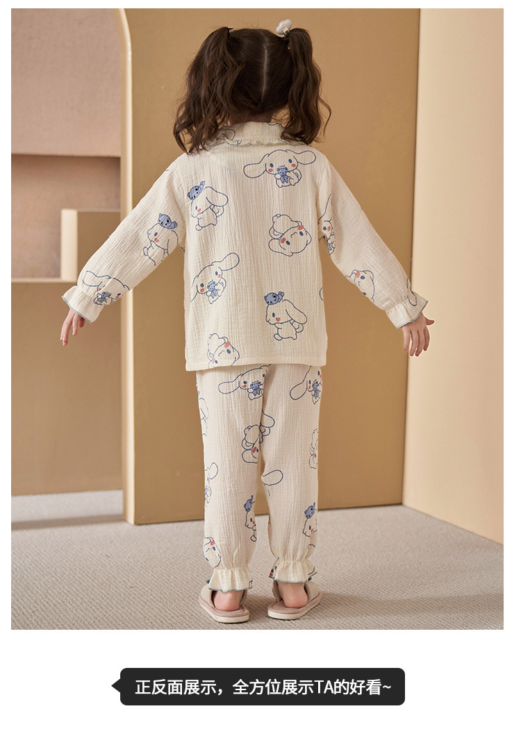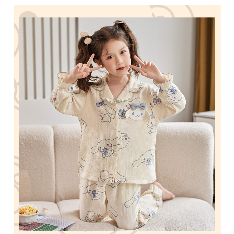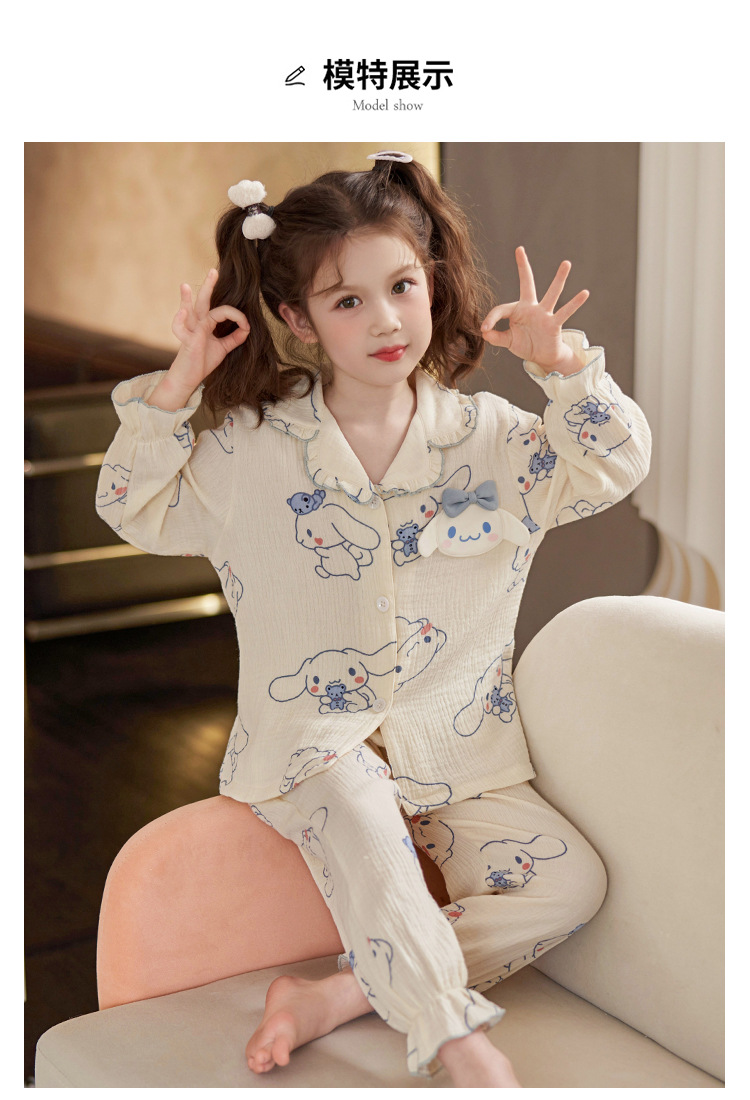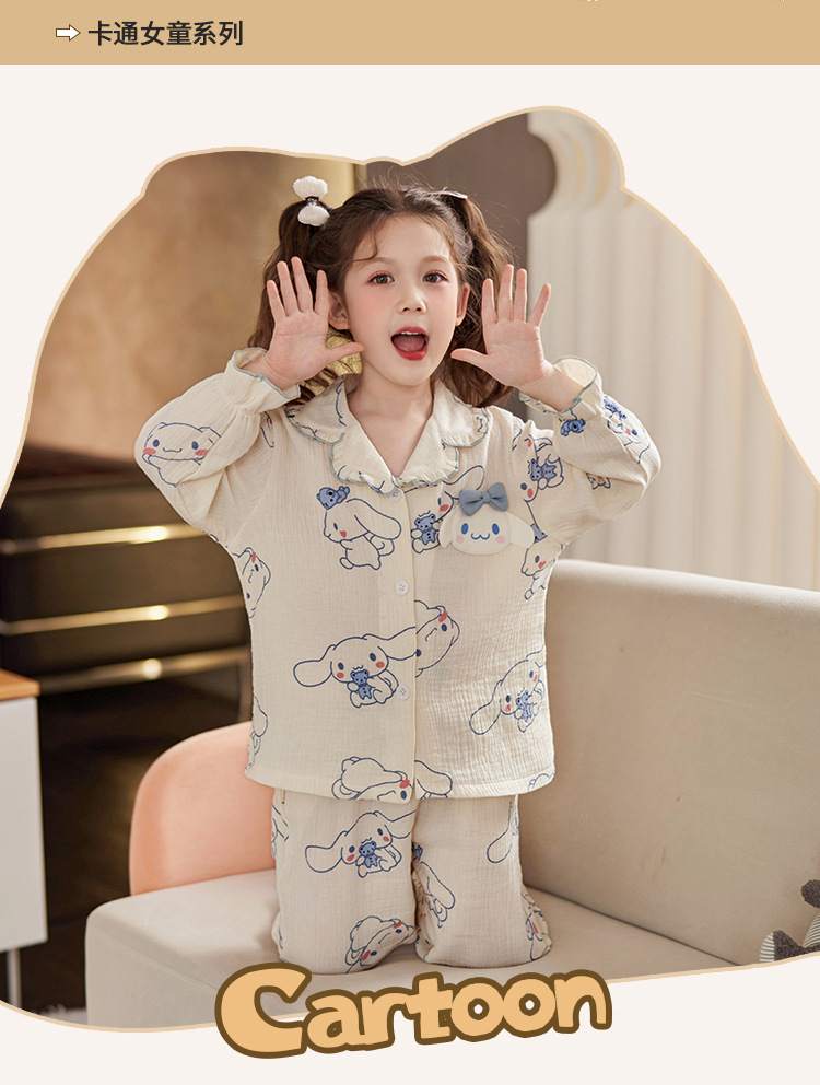 2023 새로운 여자 잠옷 어린이 순면 봄과 가을 순면 거즈 여름 옥 계피 개 어린 소녀 세트스토어 가기