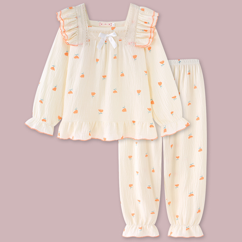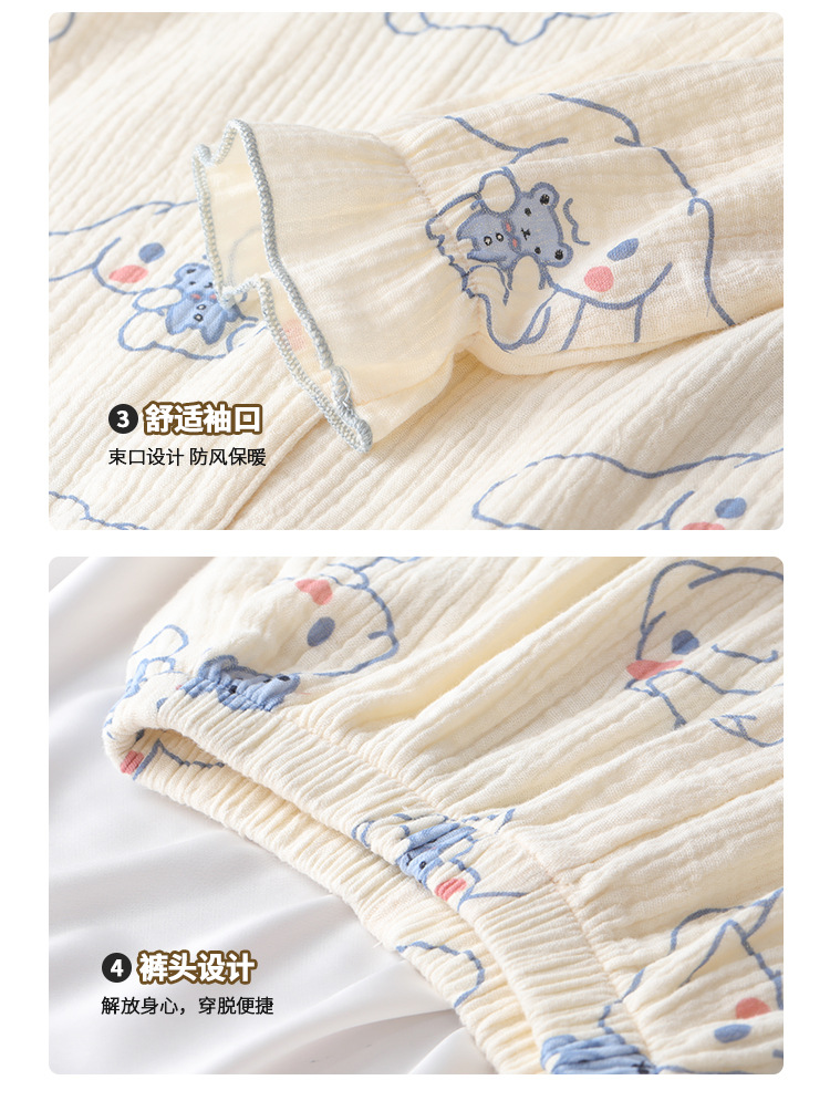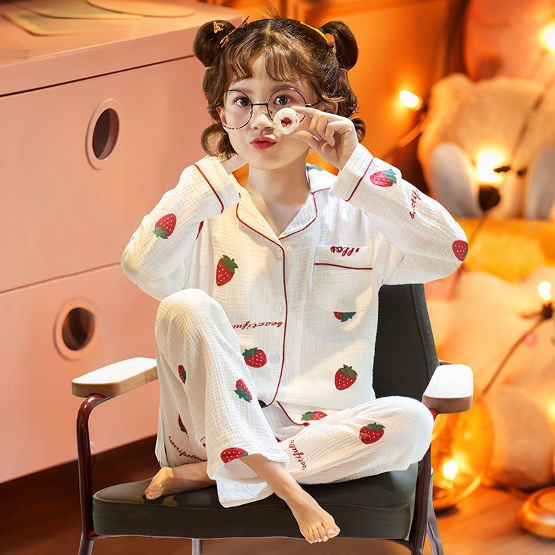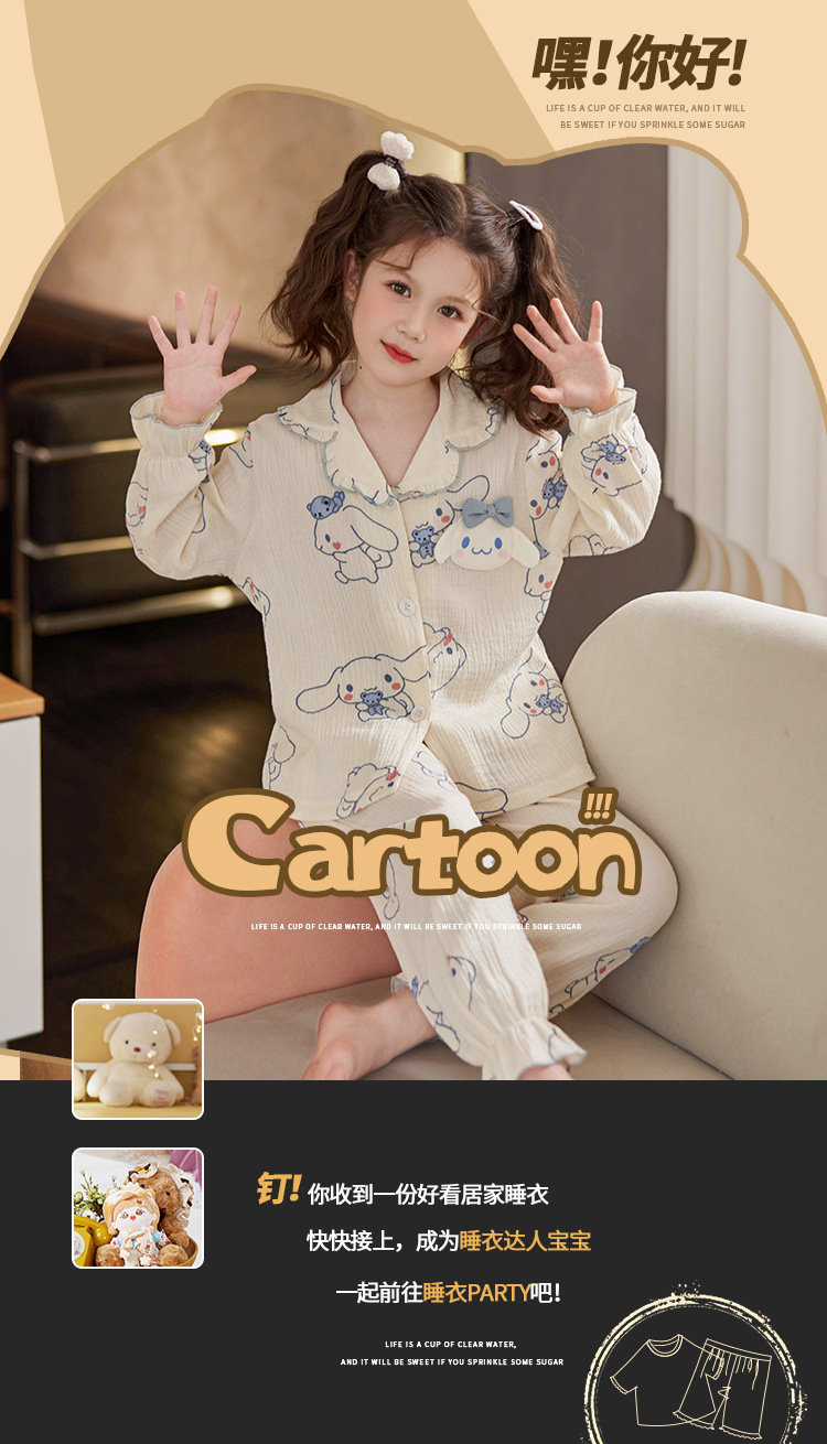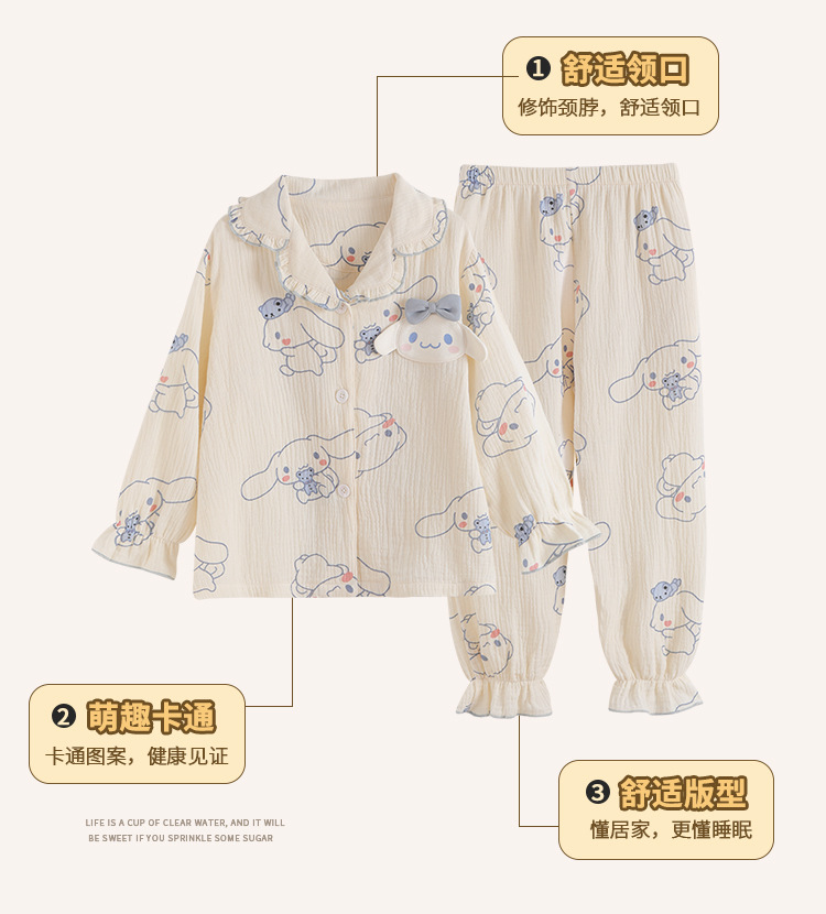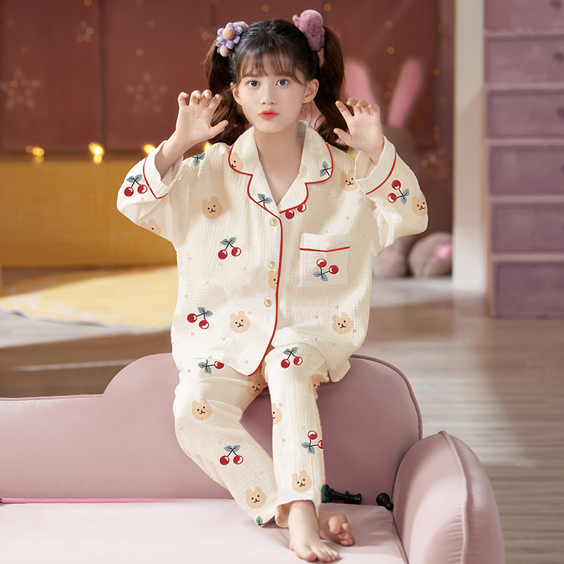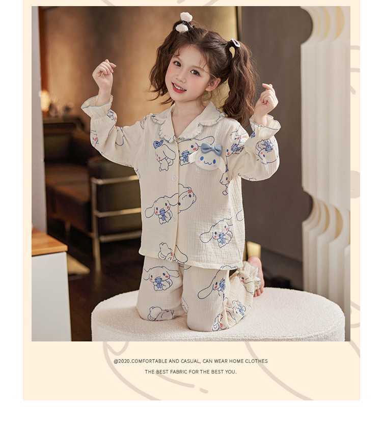 2023 새로운 여자 잠옷 어린이 순면 봄과 가을 순면 거즈 여름 옥 계피 개 어린 소녀 세트스토어 가기