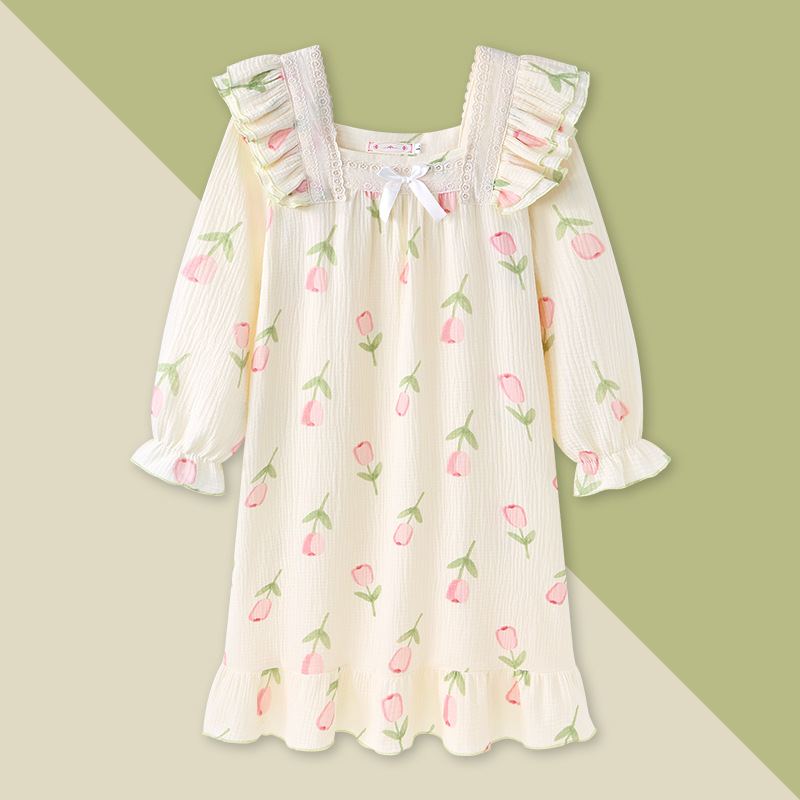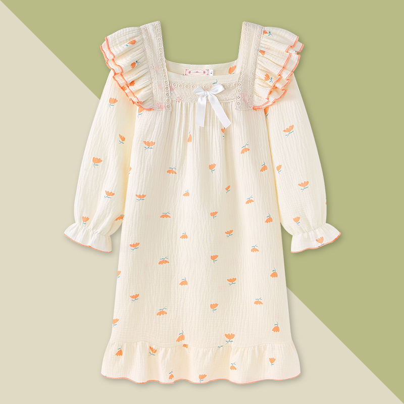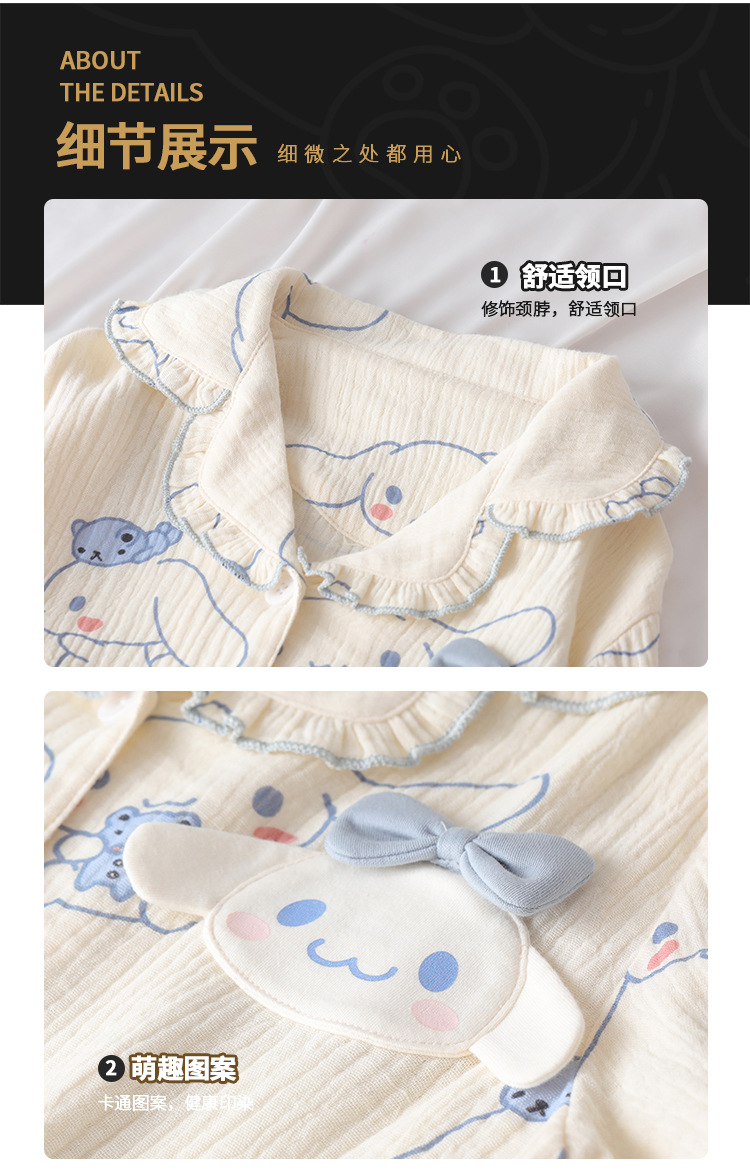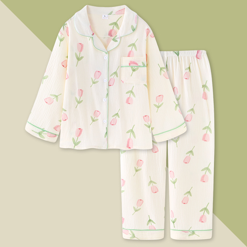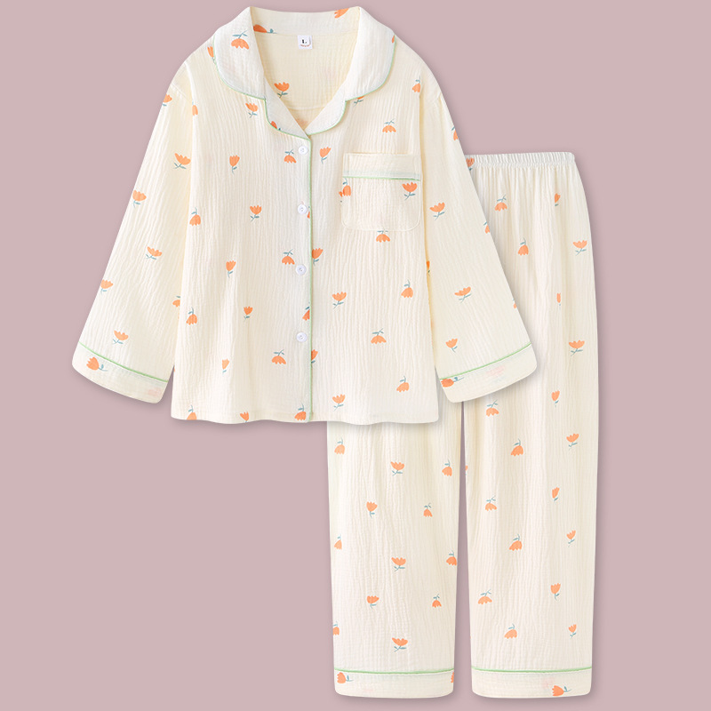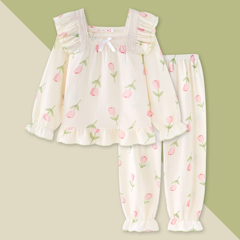 2023 새로운 여자 잠옷 어린이 순면 봄과 가을 순면 거즈 여름 옥 계피 개 어린 소녀 세트스토어 가기