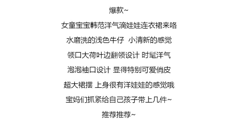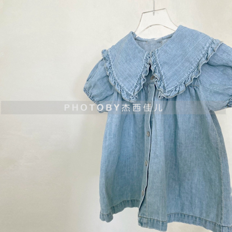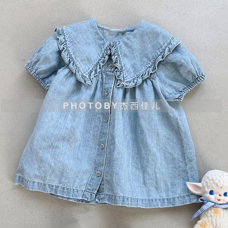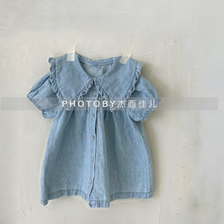 한국 스타일의 소녀 봄과 여름 새로운 원피스 어린이 레이스 큰 옷깃 퍼프 슬리브 데님 공주 인형 원피스스토어 가기