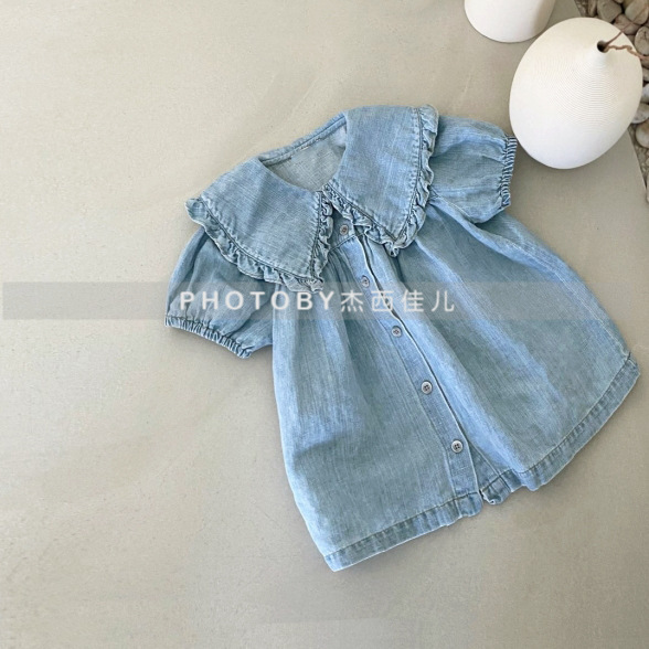 한국 스타일의 소녀 봄과 여름 새로운 원피스 어린이 레이스 큰 옷깃 퍼프 슬리브 데님 공주 인형 원피스