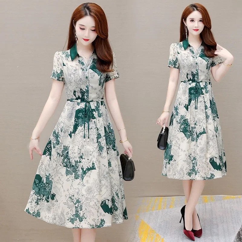 한국 스타일 세련된 인쇄 원피스 여자의 2023 여름 새로운 허리 슬리밍 우아한 여자의 하이 웨이스트 레이스 업 원피스