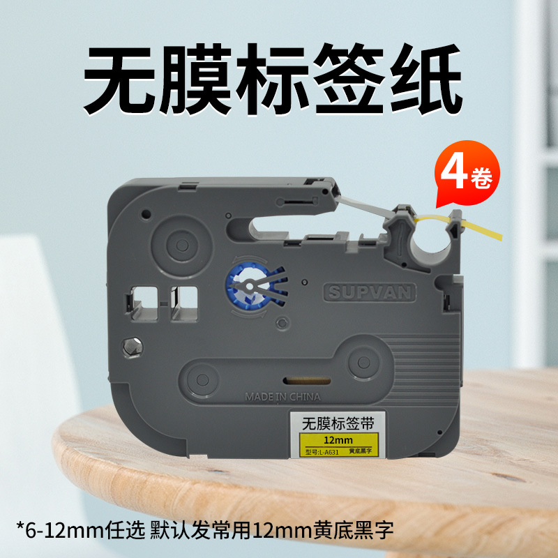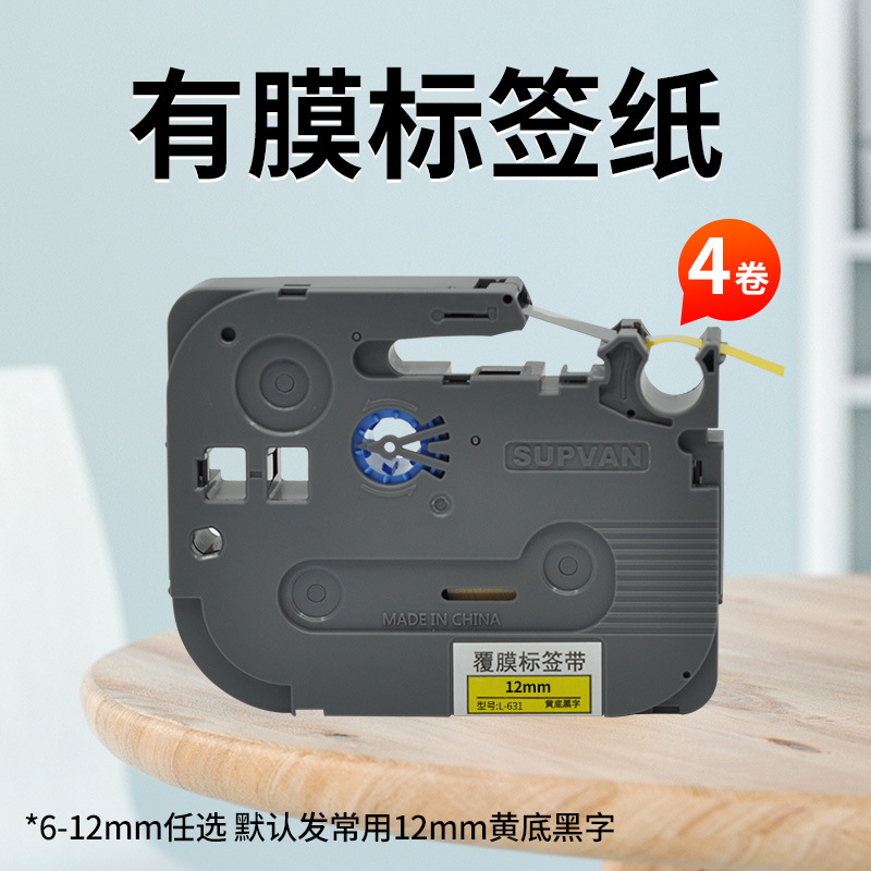 • 무광택 라벨지 4롤 (기계 미포함)|(6-12mm 선택 가능, 기본값은 일반적으로 사용되는 12mm 노란색 배경에 검정색 텍스트입니다.