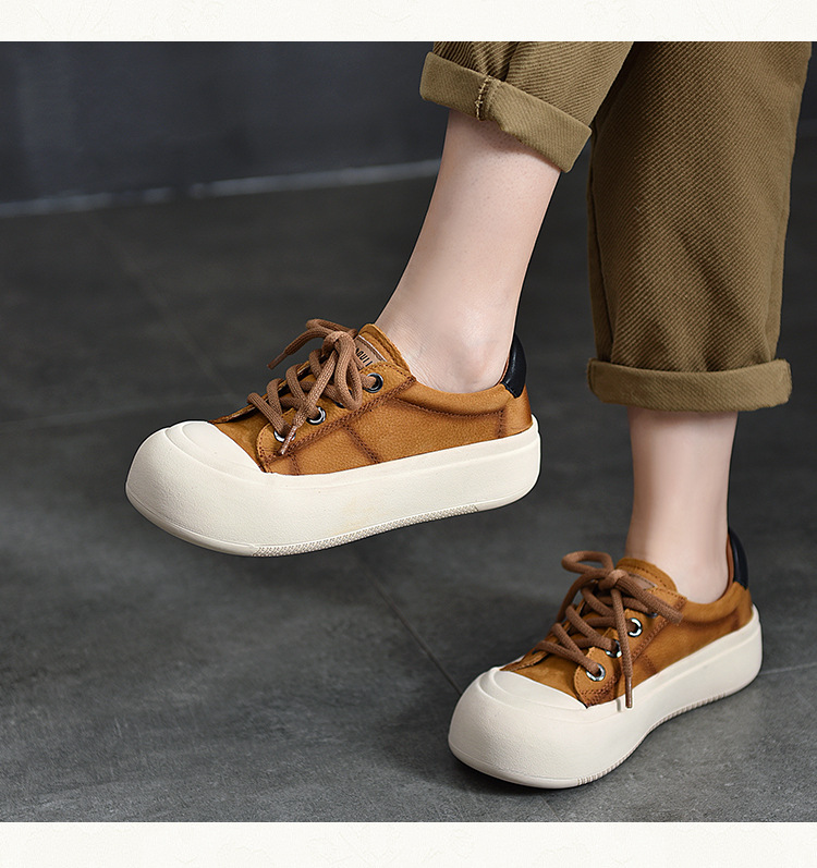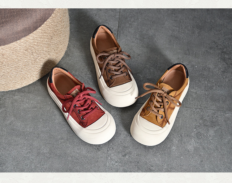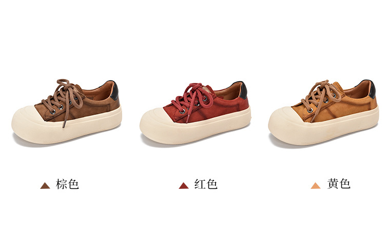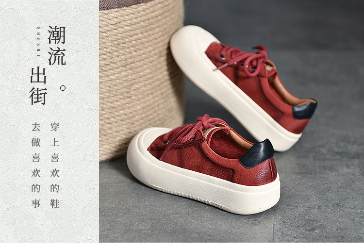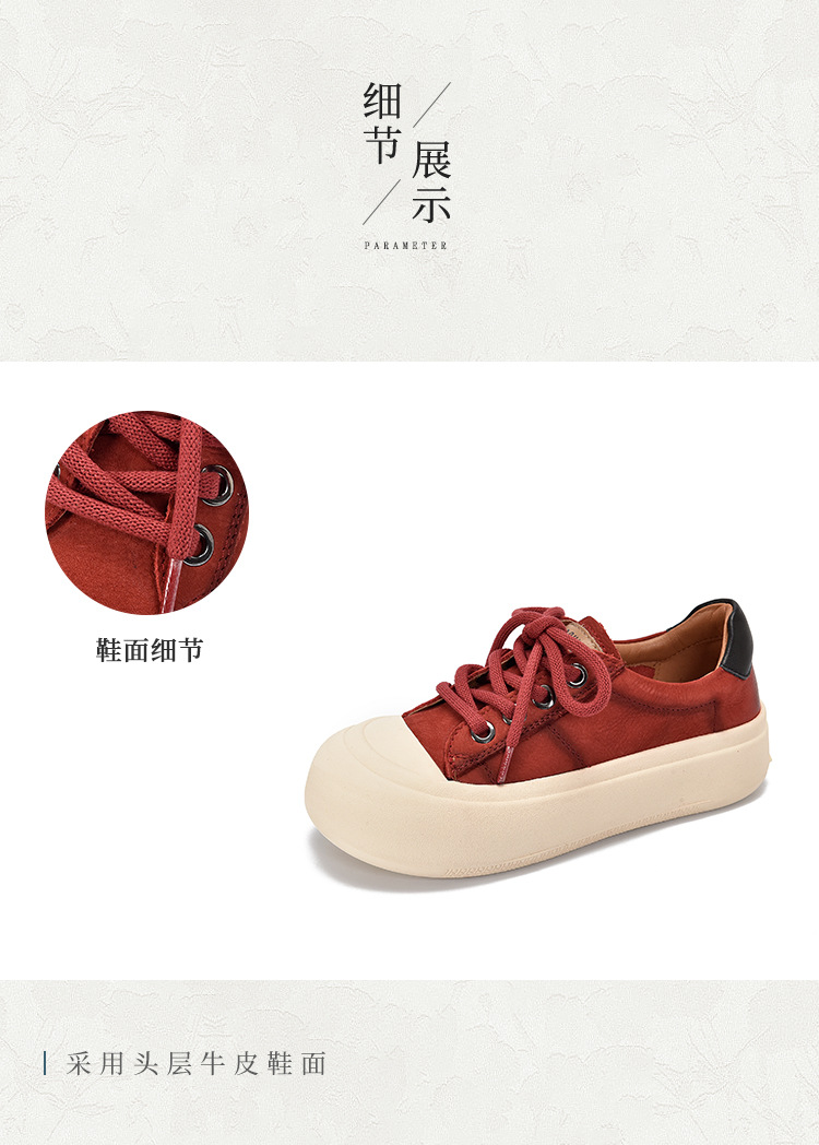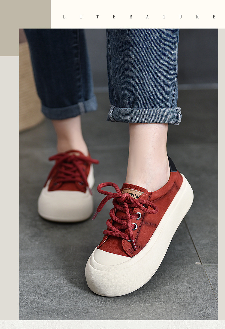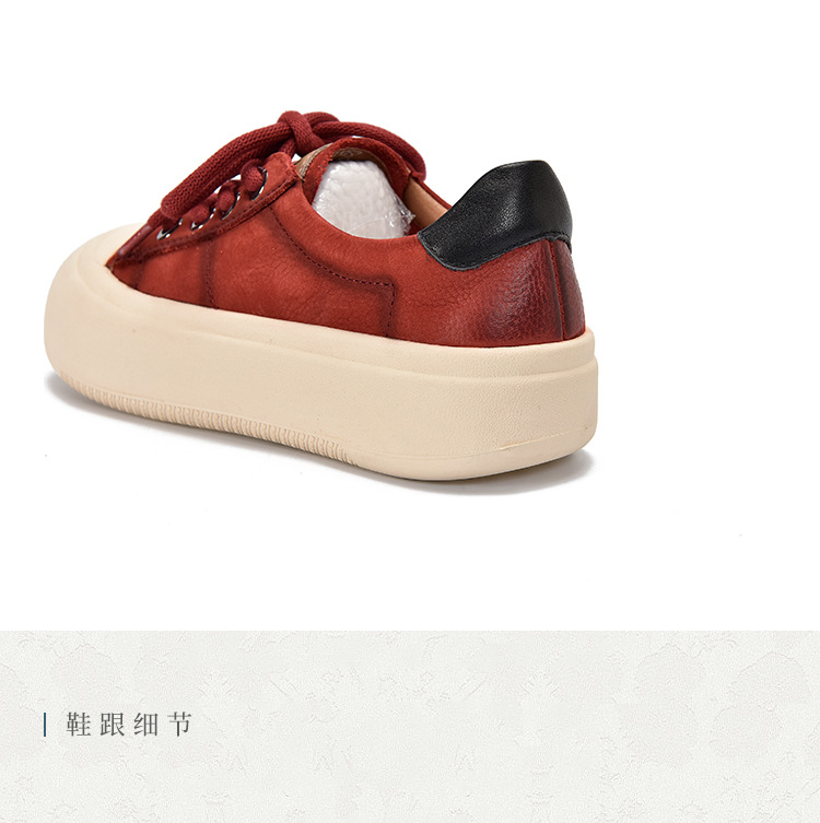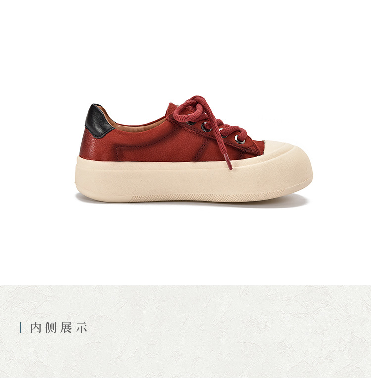 여성을위한 첫 번째 레이어 소 가죽 캐주얼 신발 2025 가을 빨간색 레이스 업 로우 탑 대형 라운드 발가락 여성 신발 복고풍 플랫 힐 스니커즈